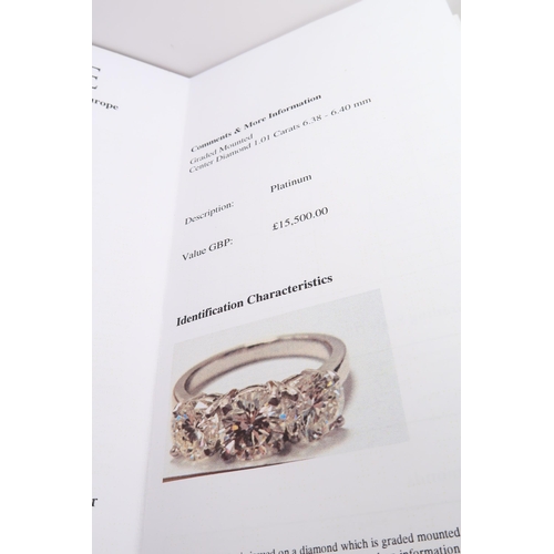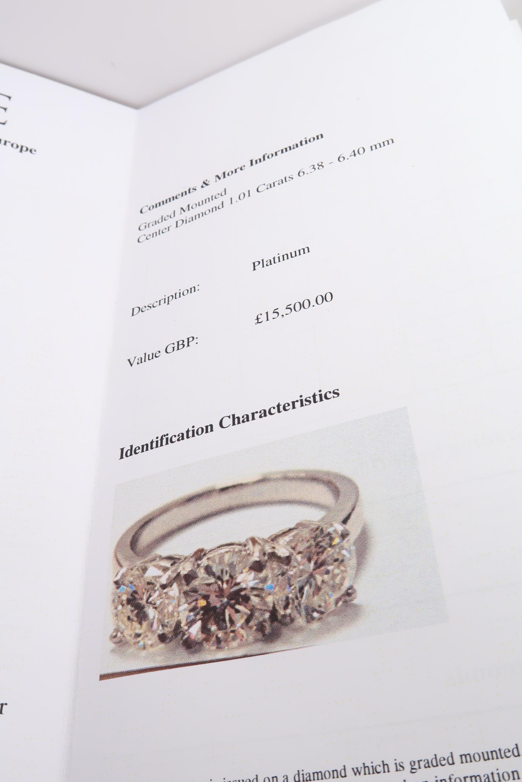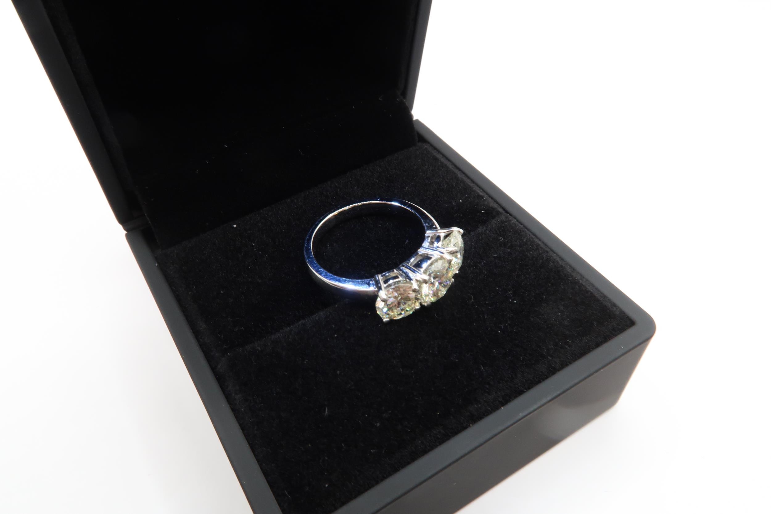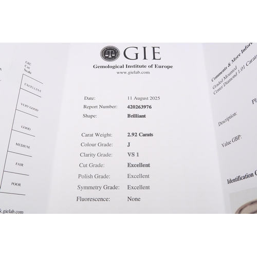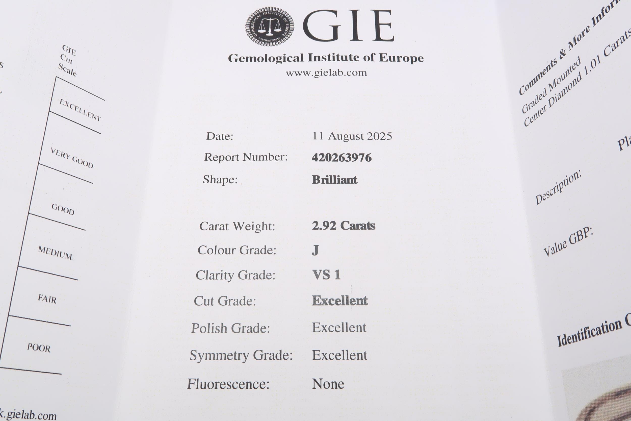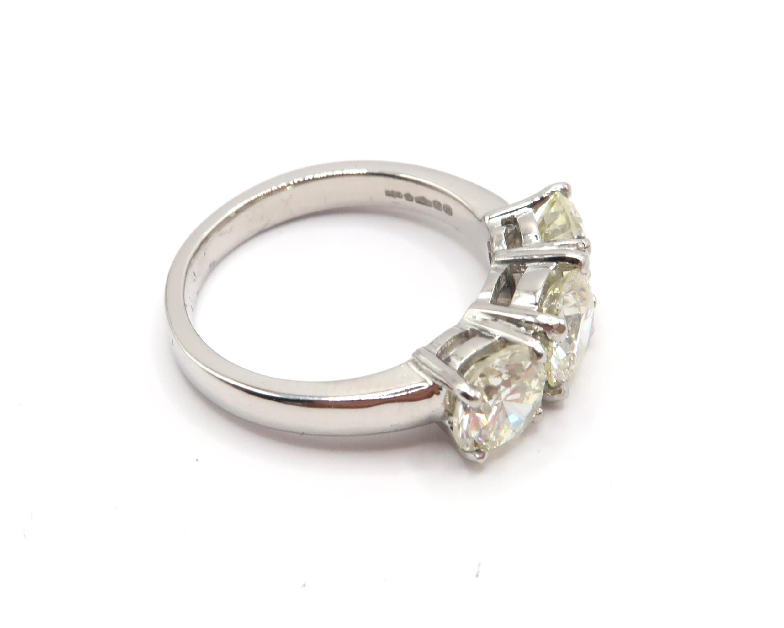 A Stunning Platinum 3 Stone Diamond Ring, Diamonds are well Matched and Good Colour and Clarity, Colour approx. J, Clarity approx. VS1, total diamond weight approx 2.92ct - Comes with a Current GIE Certificate and Valuation, Ring Size approx. L/M