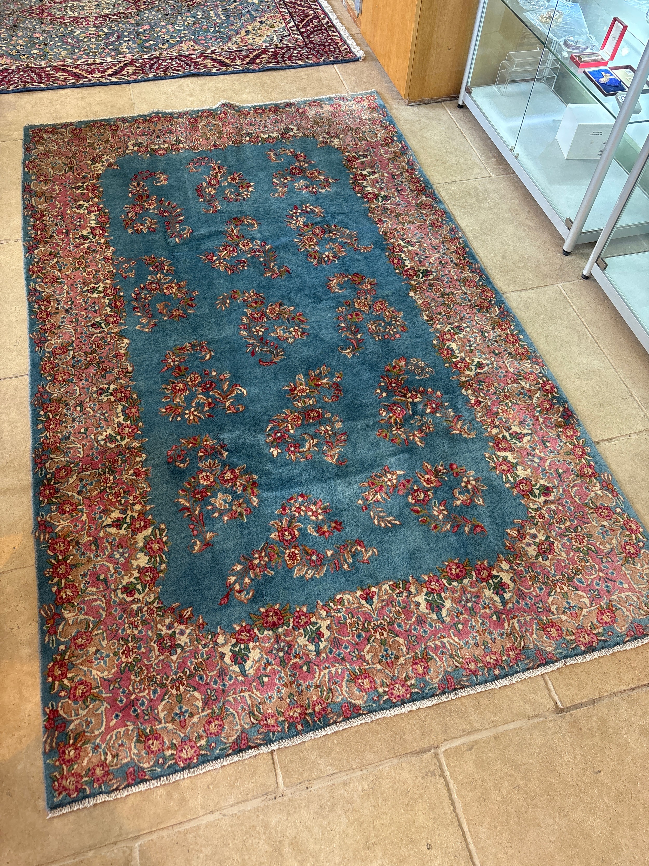 A hand knotted woollen Kirman rug - 2.44m x 1.47m