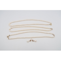 A group of three strings of cultured pearls, two with 9ct gold clasps.