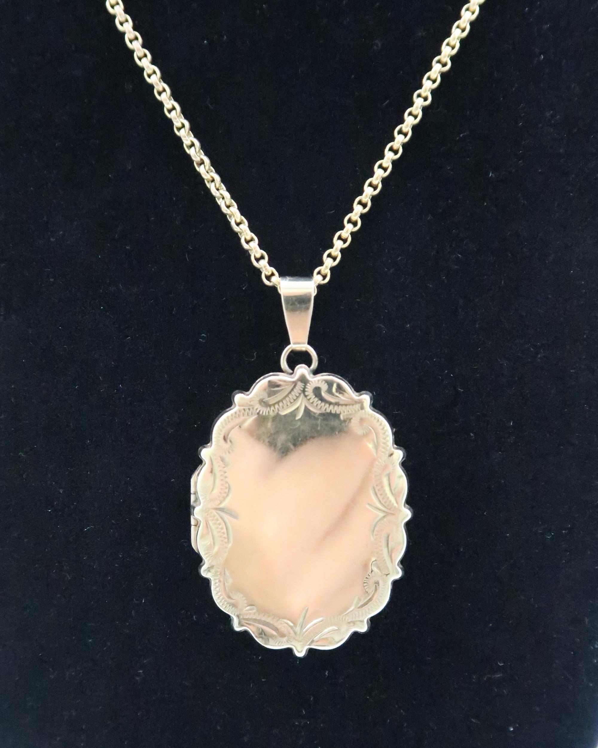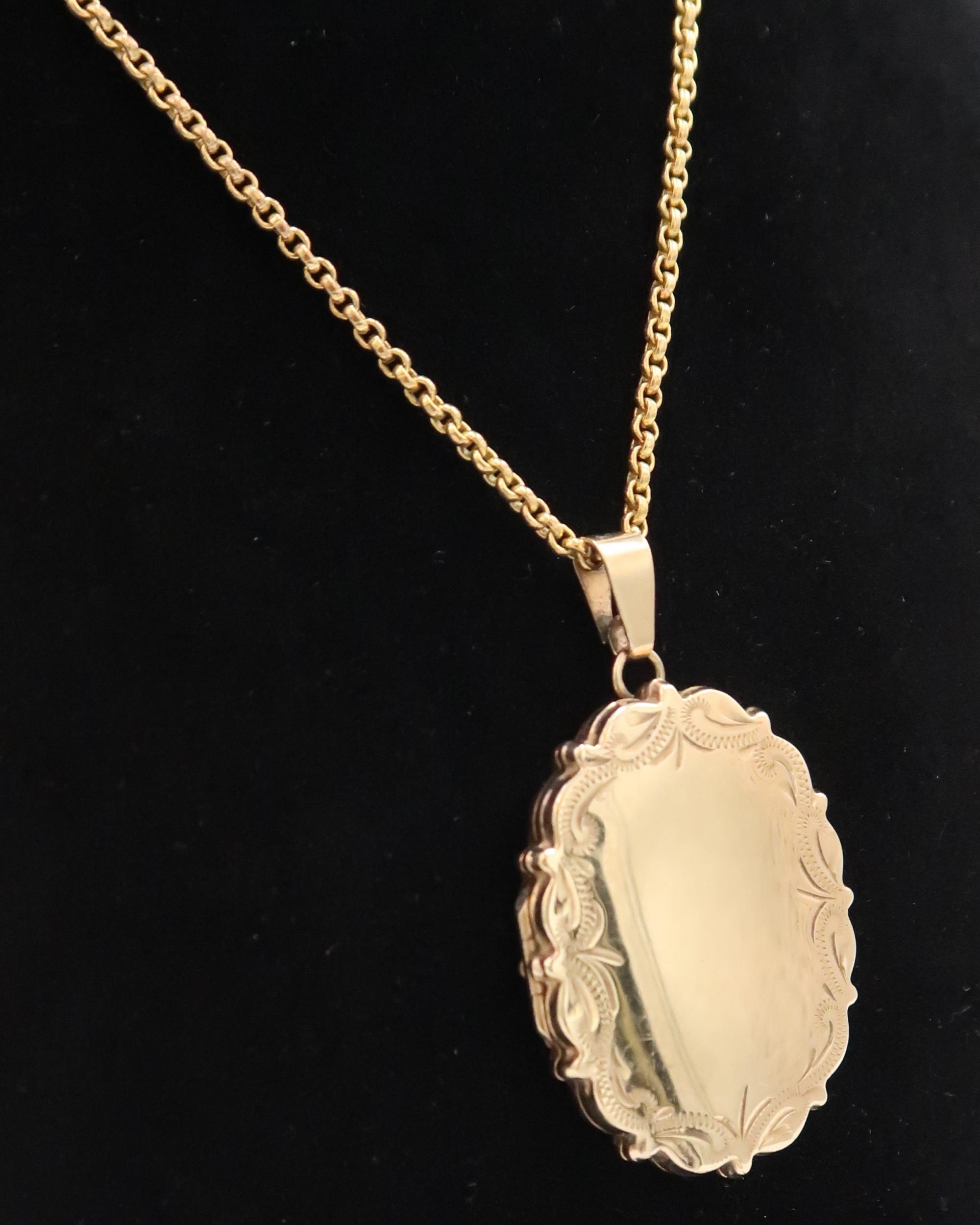 A 9ct gold oval locket and chain. Weight 14.67 grams