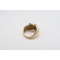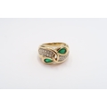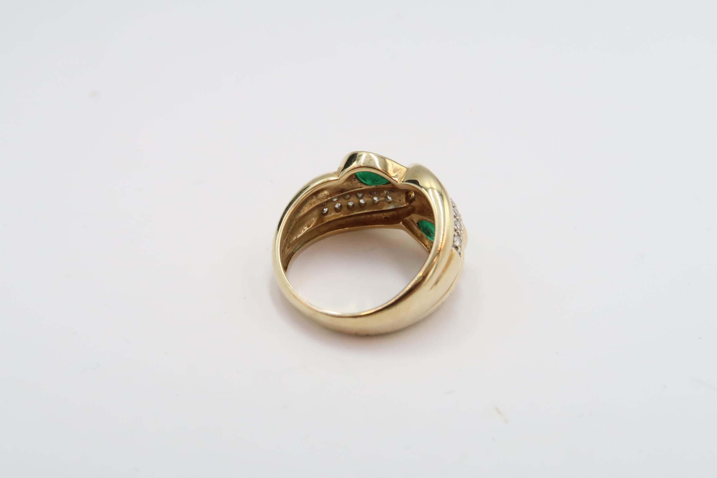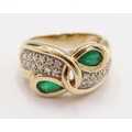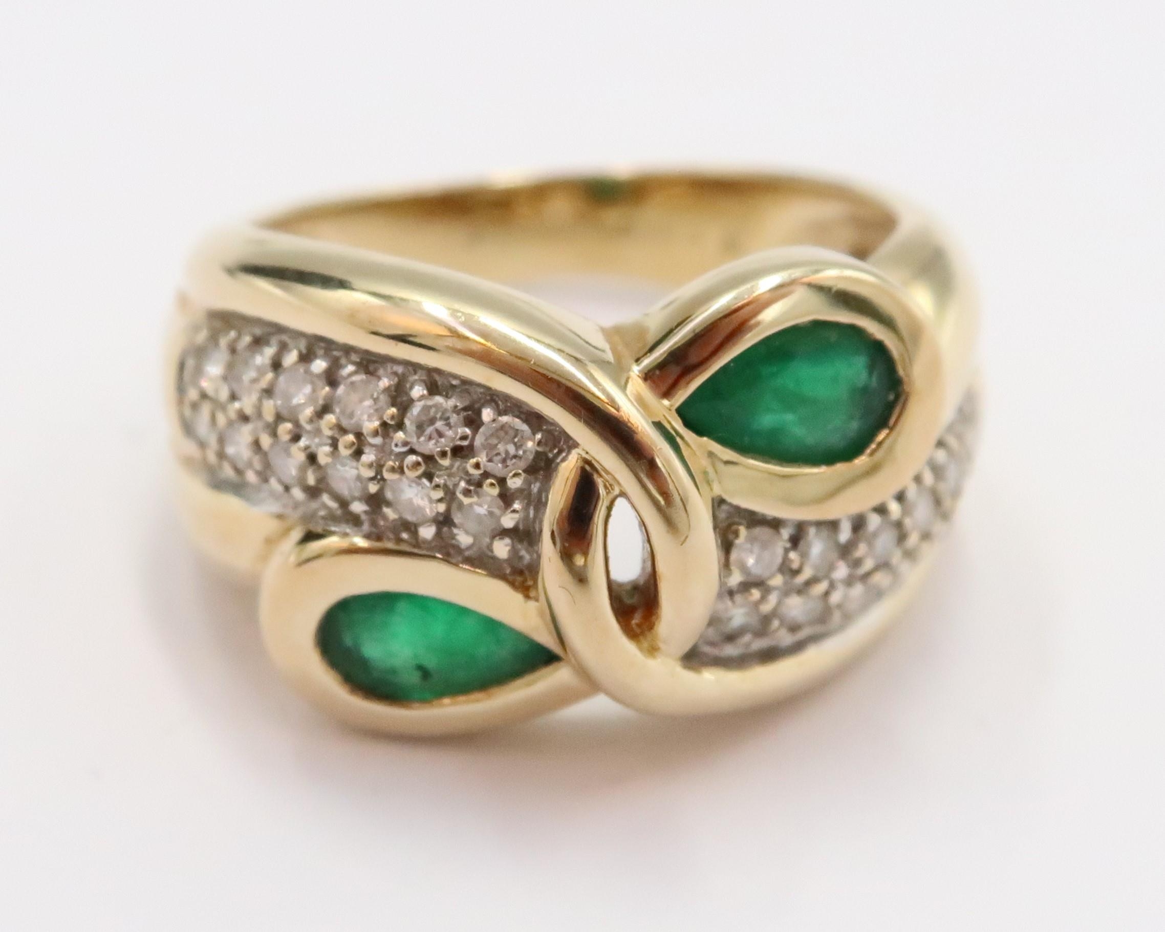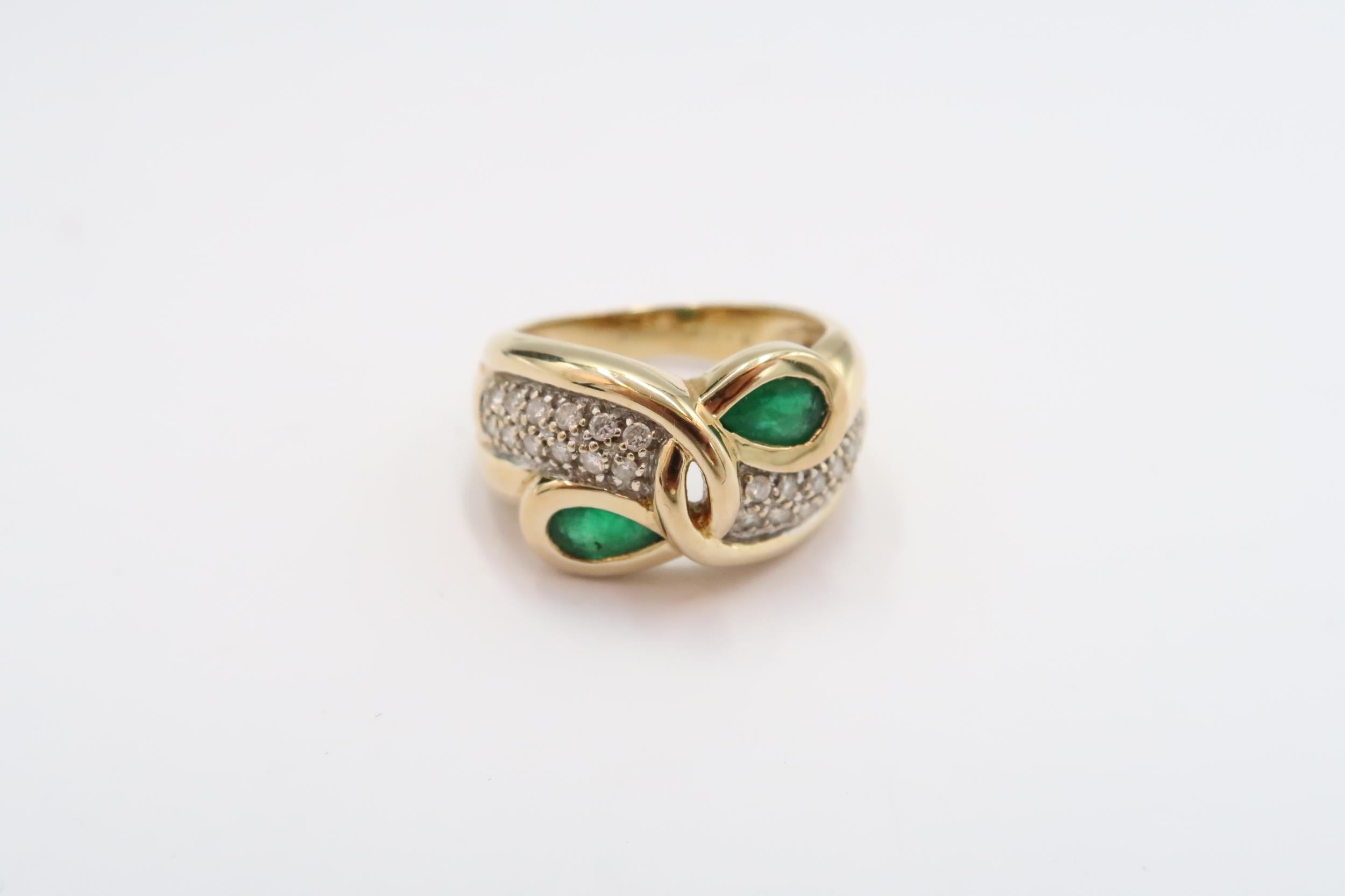 A 14ct pear shape emerald and brilliant cut diamond crossover style ring. Size M 1/2. Weight 8.71 grams