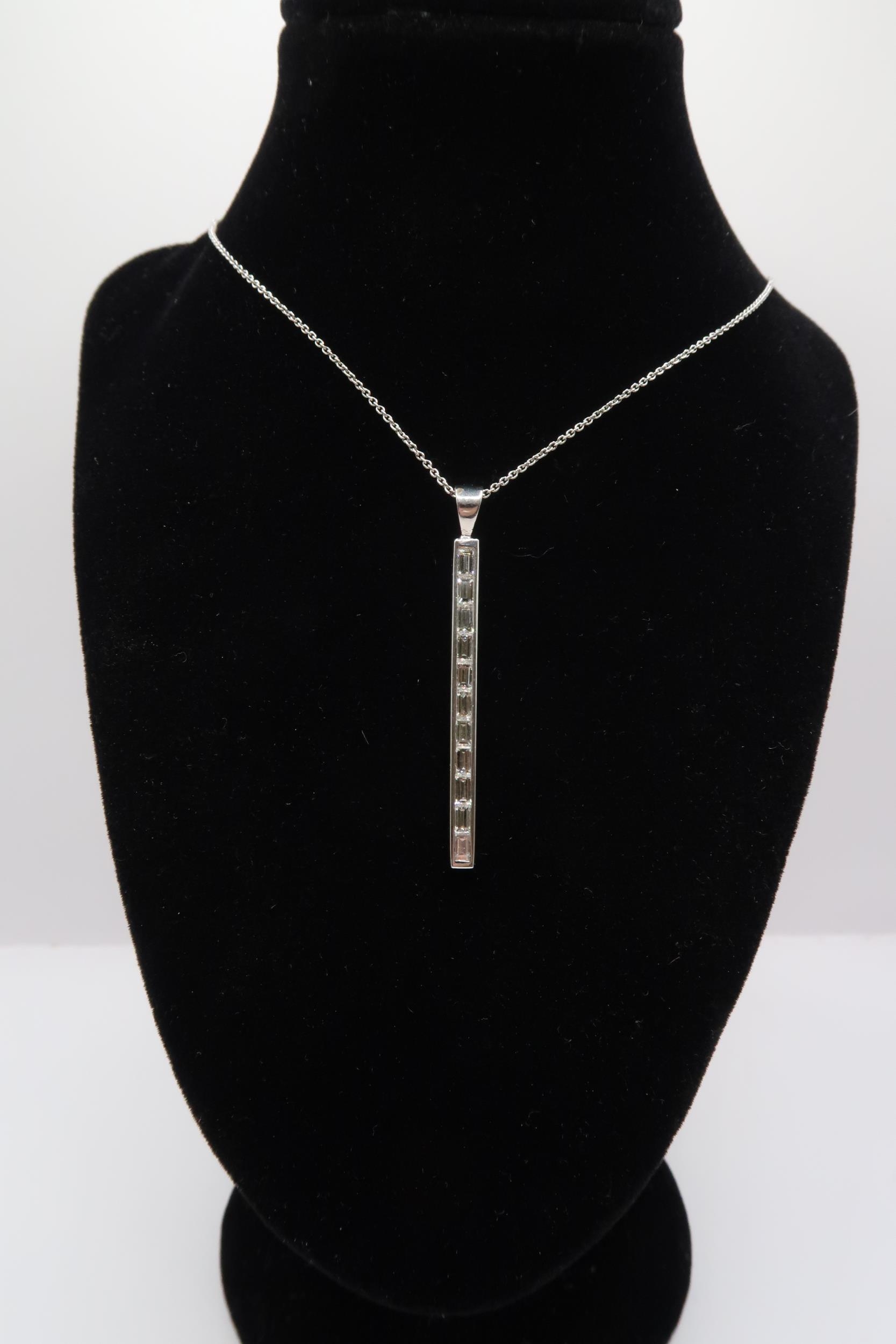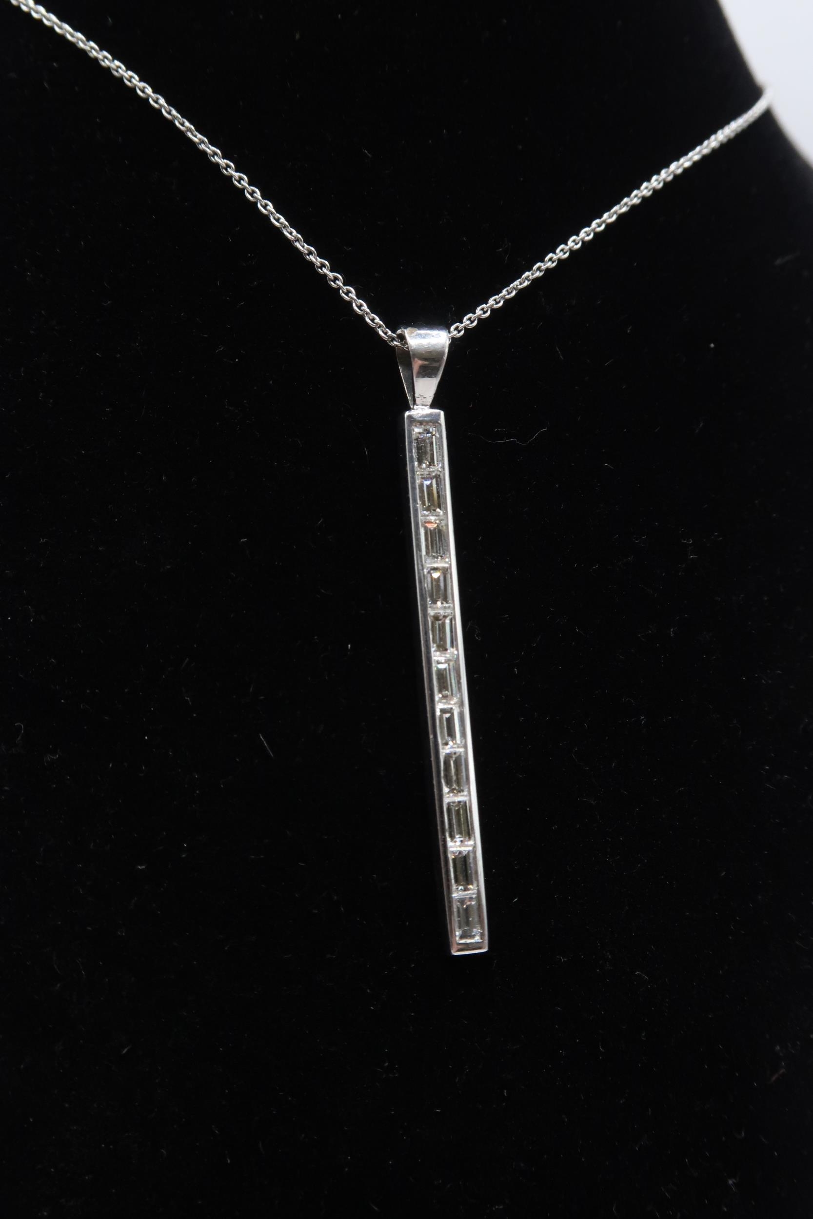 An 18ct gold baguette diamond line pendant. Length of pendant 40mm. Weight 3.62 grams