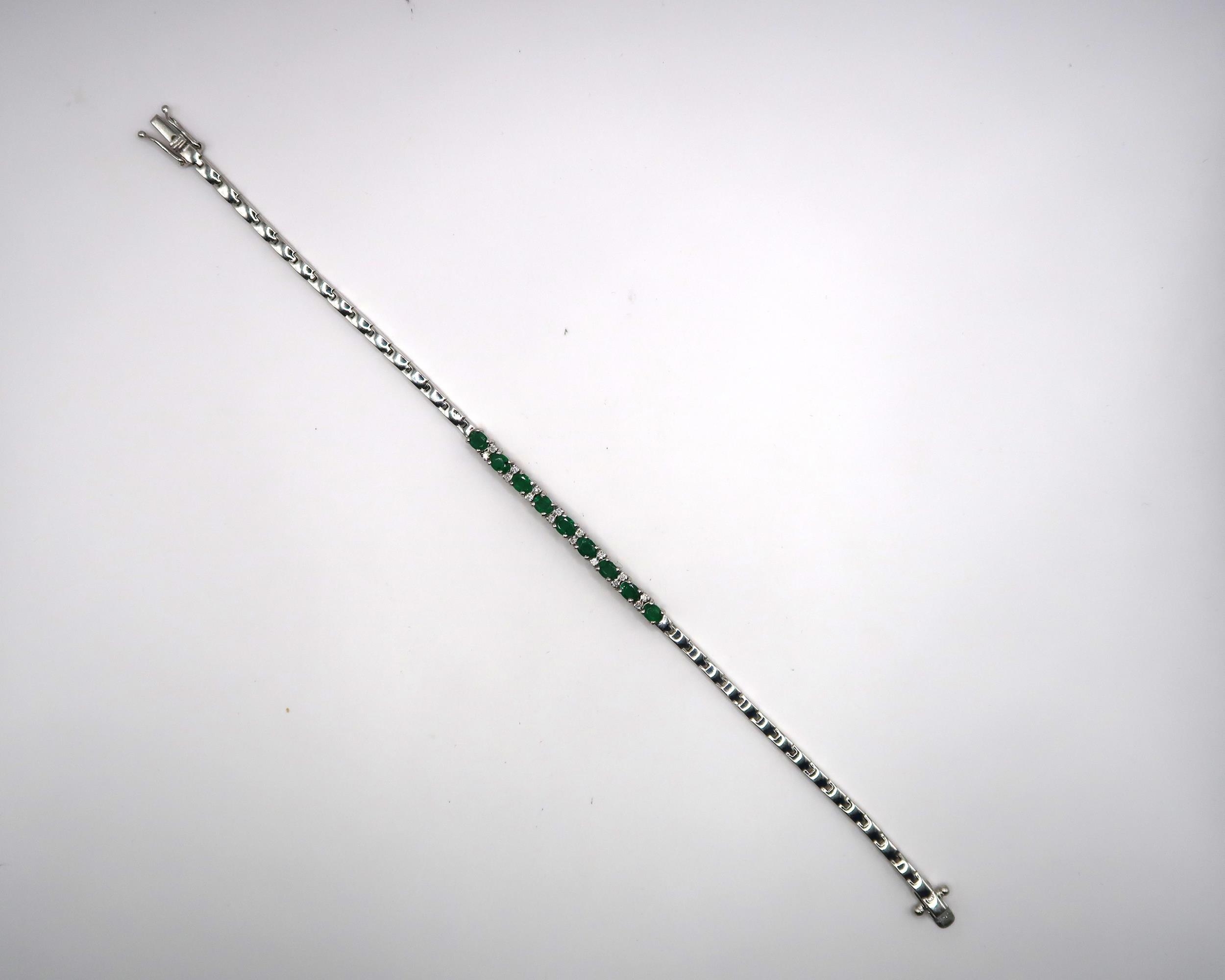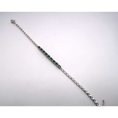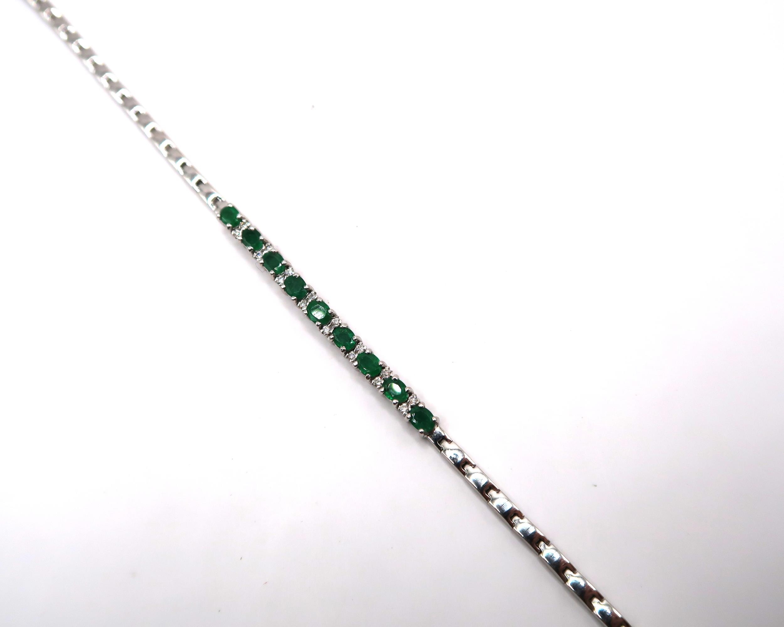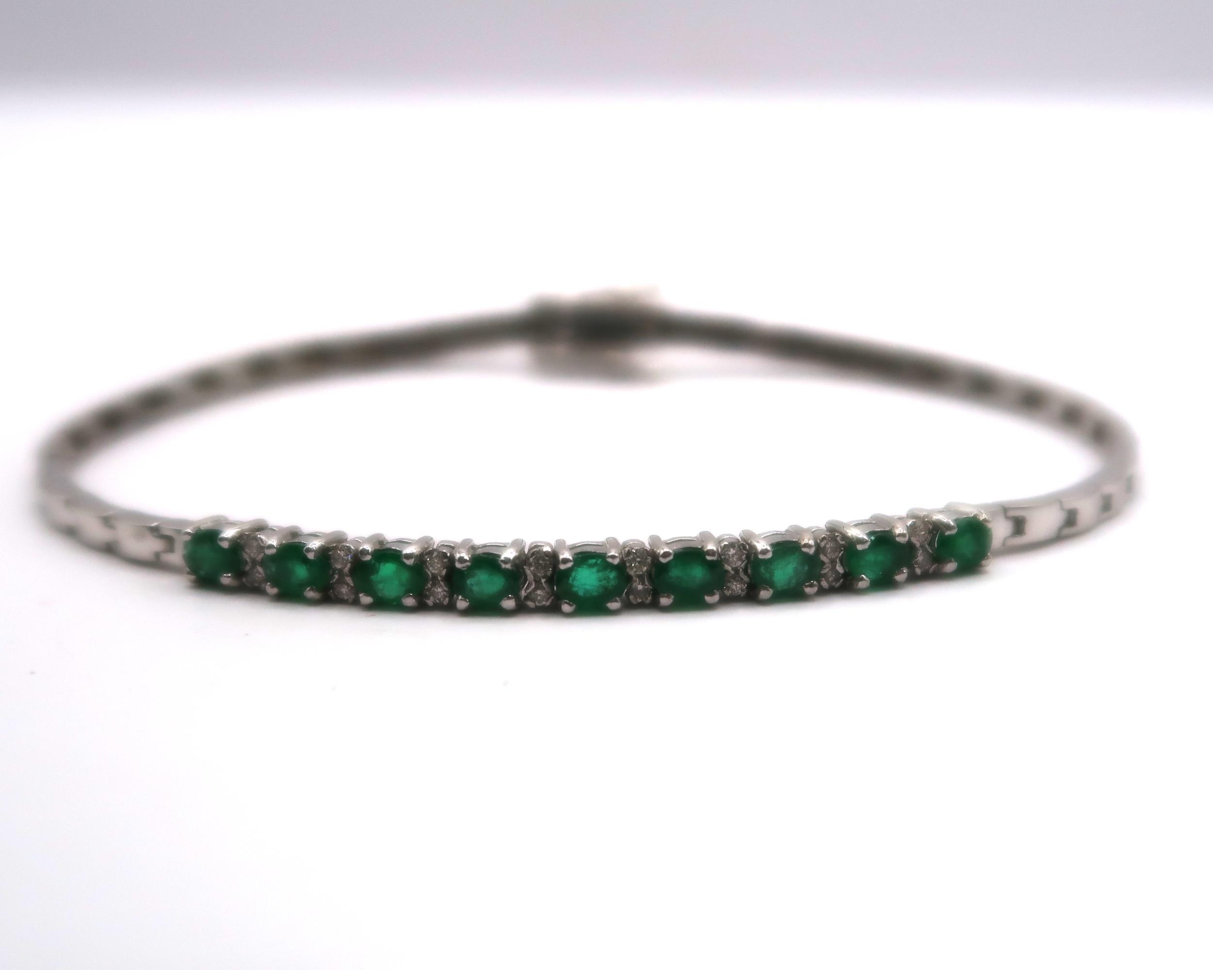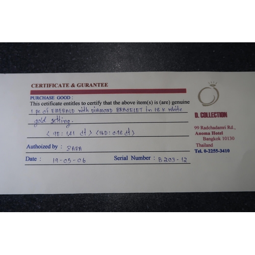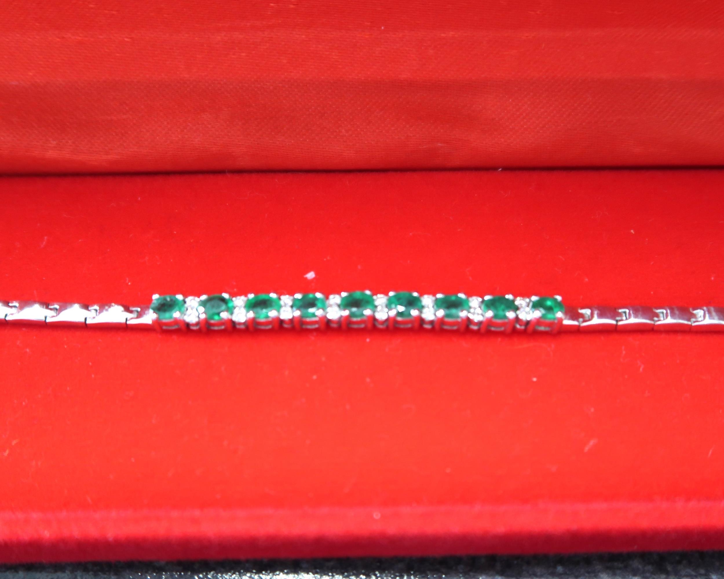 An 18ct white gold, emerald and diamond bracelet of reticulated form, set with nine oval cut emeralds, interspersed with a pair of small diamonds, 18cm, total weight 10.8g, complete with original certificate.
