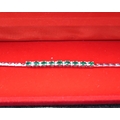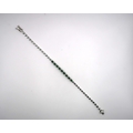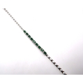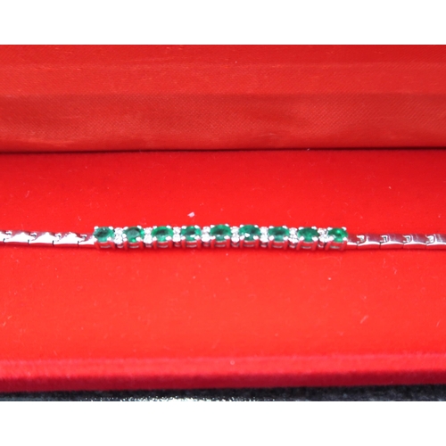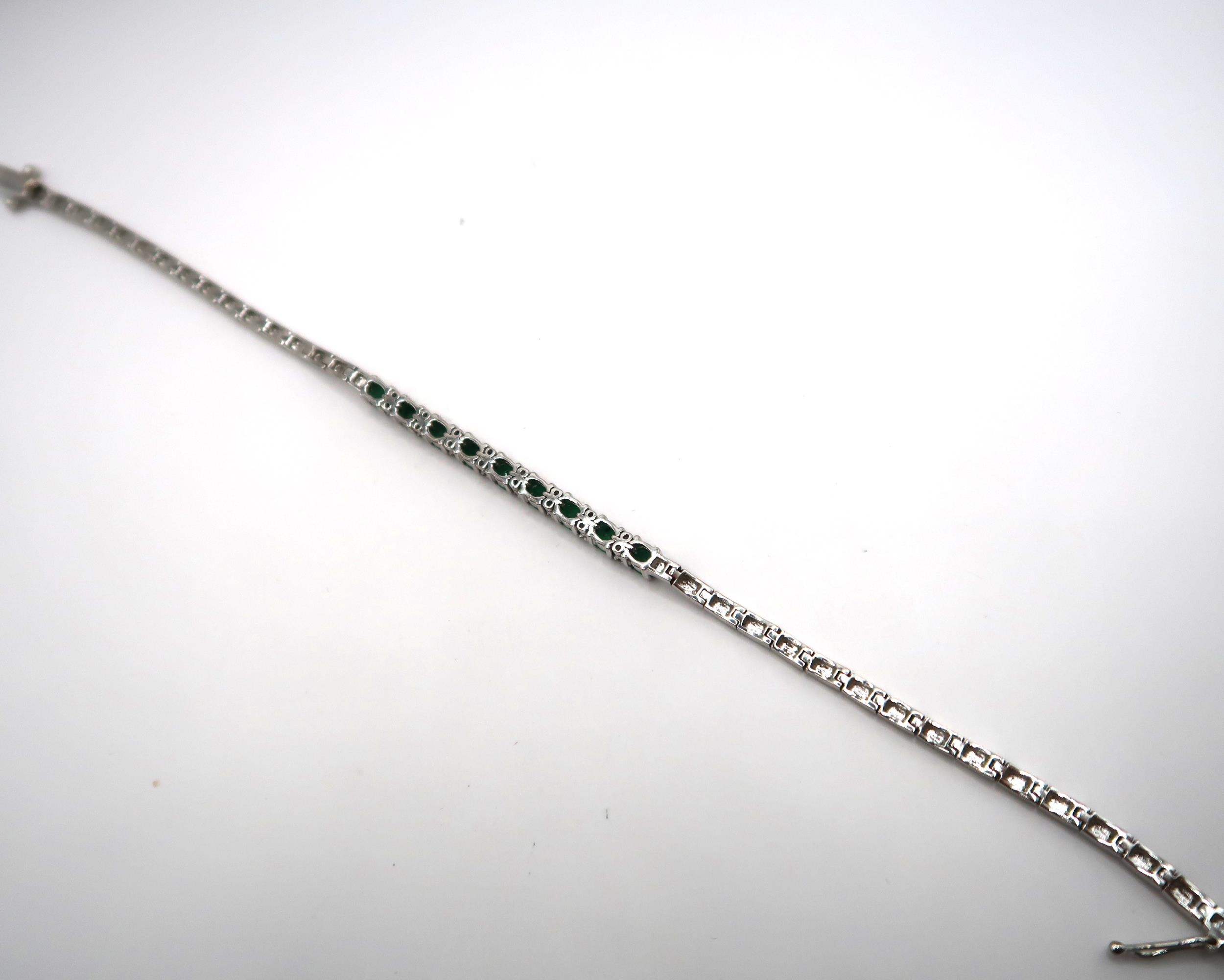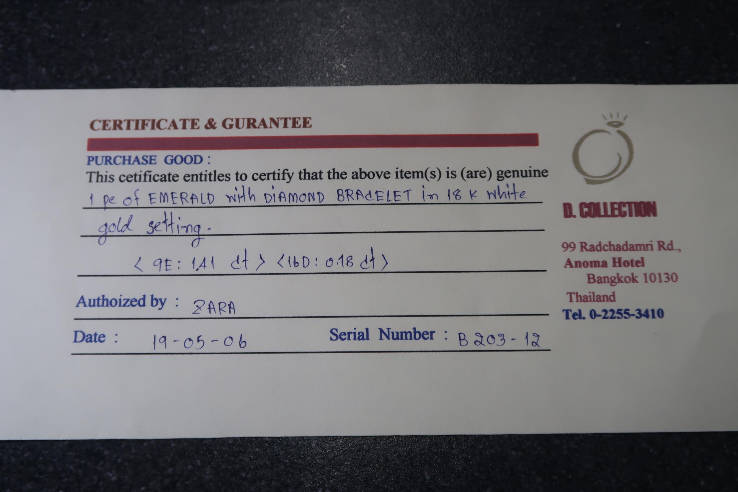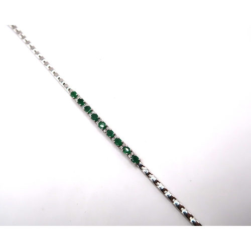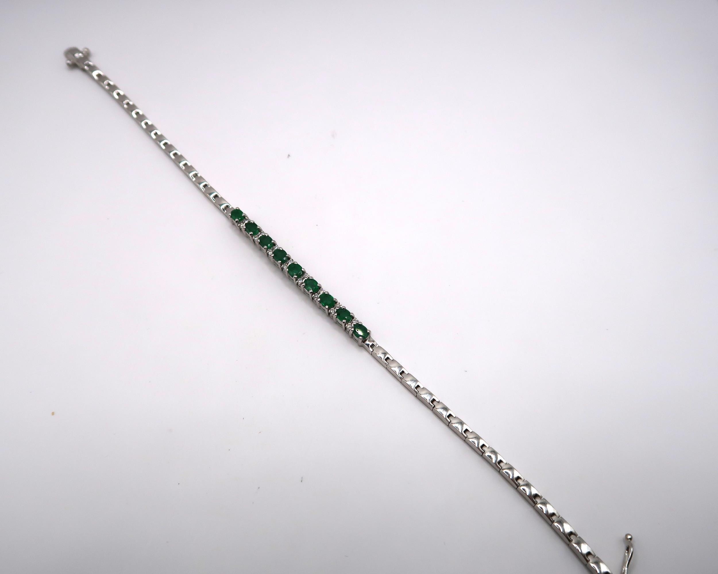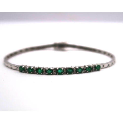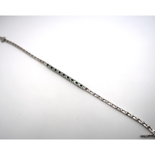 An 18ct white gold, emerald and diamond bracelet of reticulated form, set with nine oval cut emeralds, interspersed with a pair of small diamonds, 18cm, total weight 10.8g, complete with original certificate.