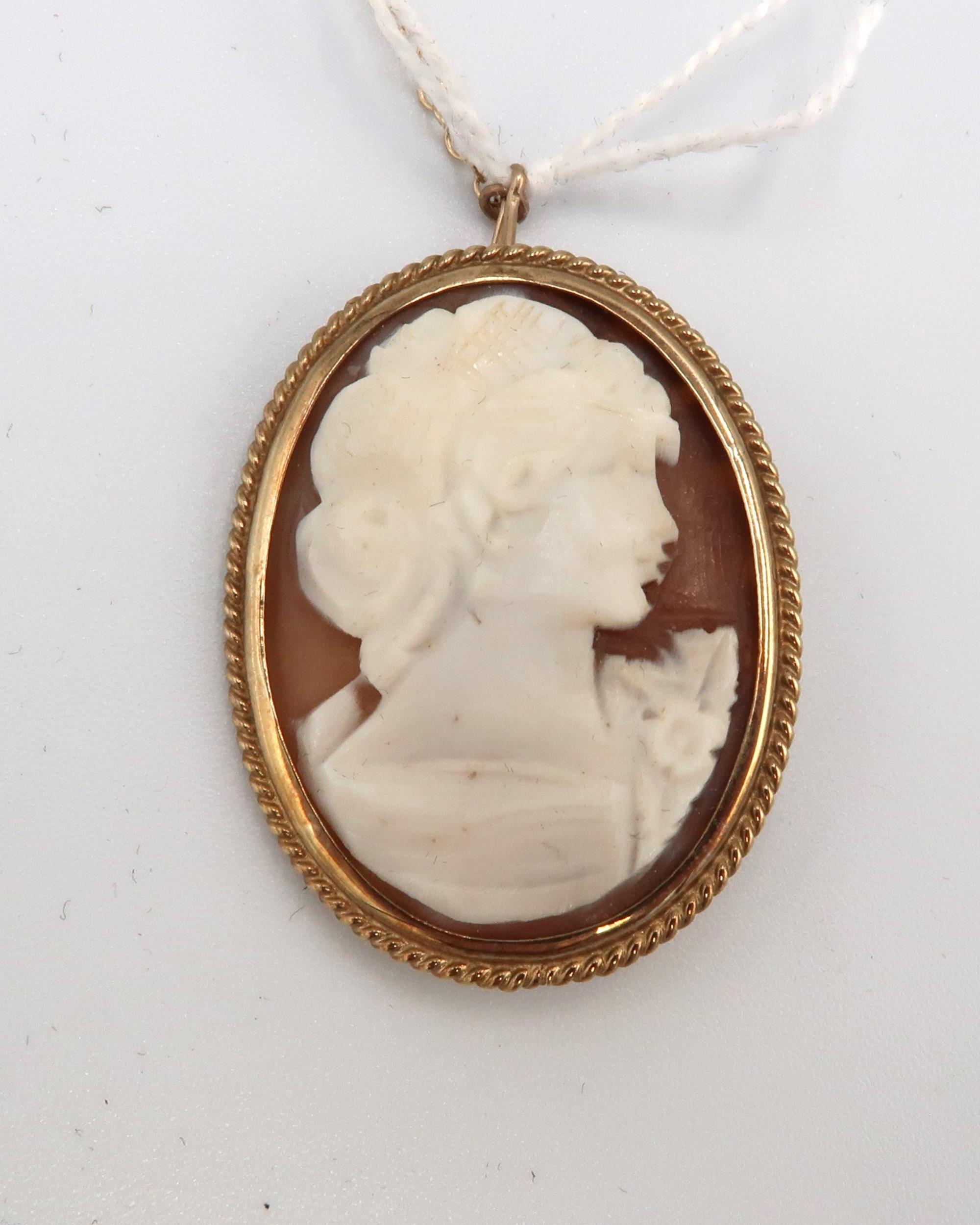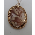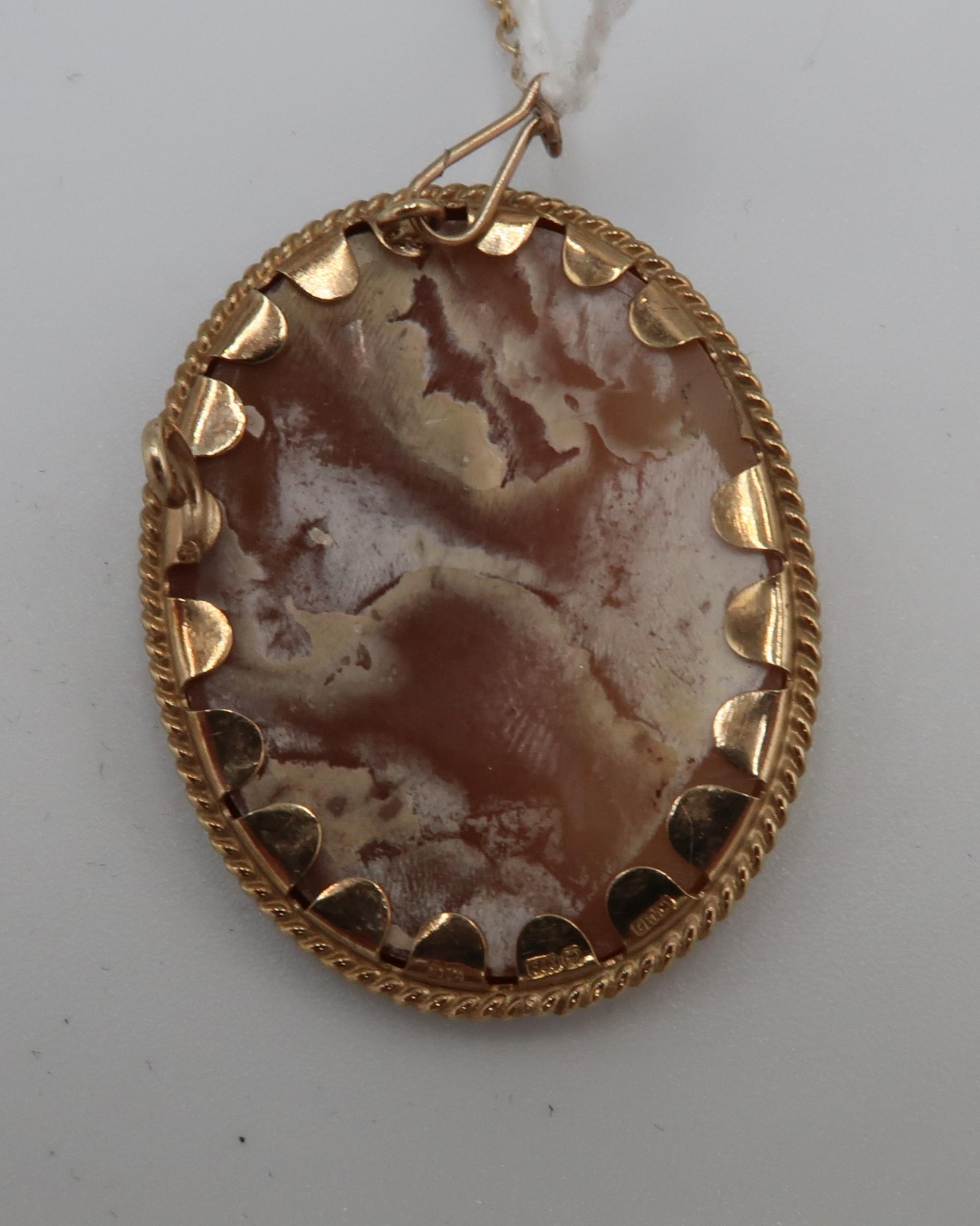 An oval cameo panel within a 9ct gold frame. Length 33mm. Weight 5.27 grams. Brooch fitting missing.
