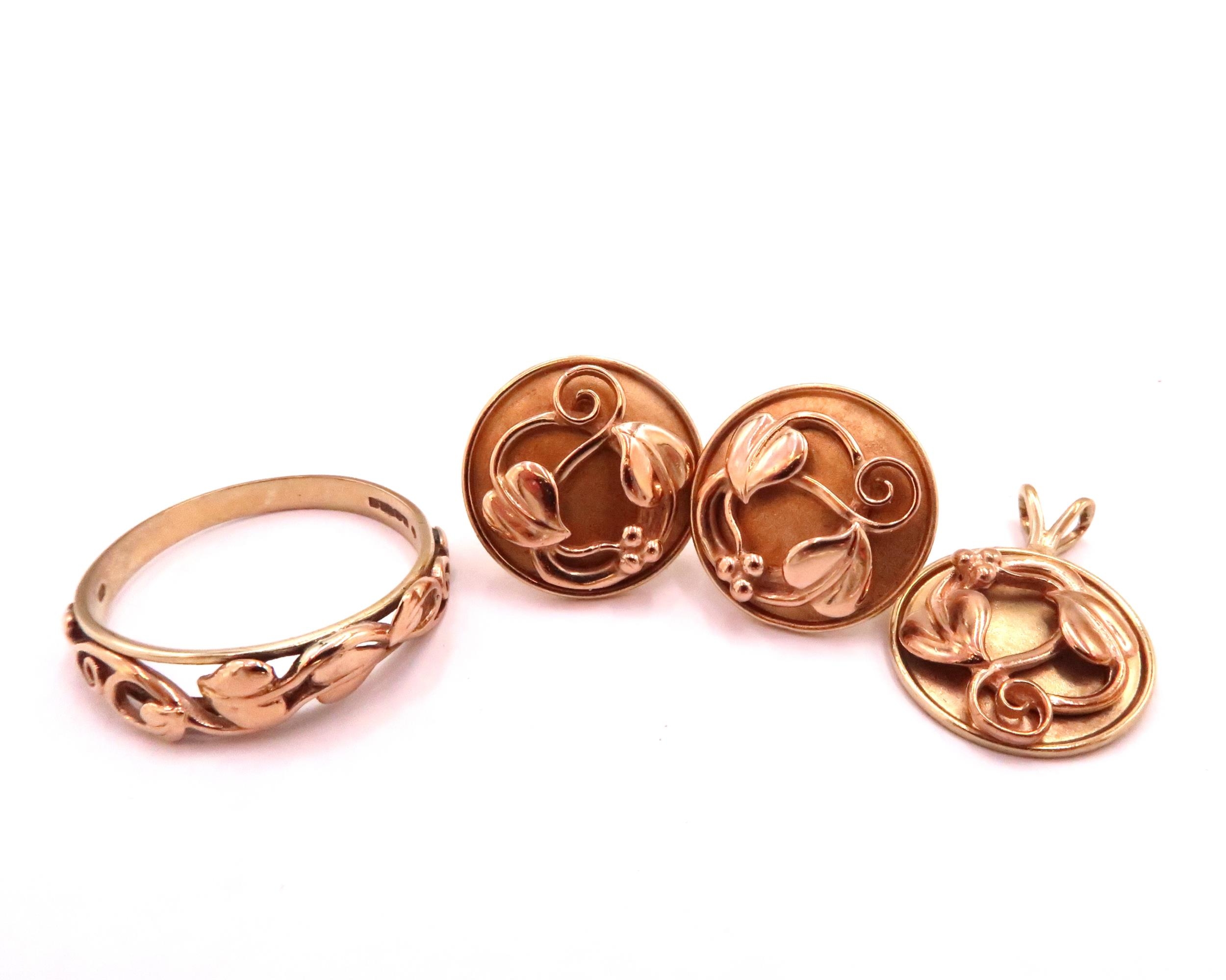 Clogau - a 9ct gold ring, size R, pendant and earring set. Weight 9.79 grams