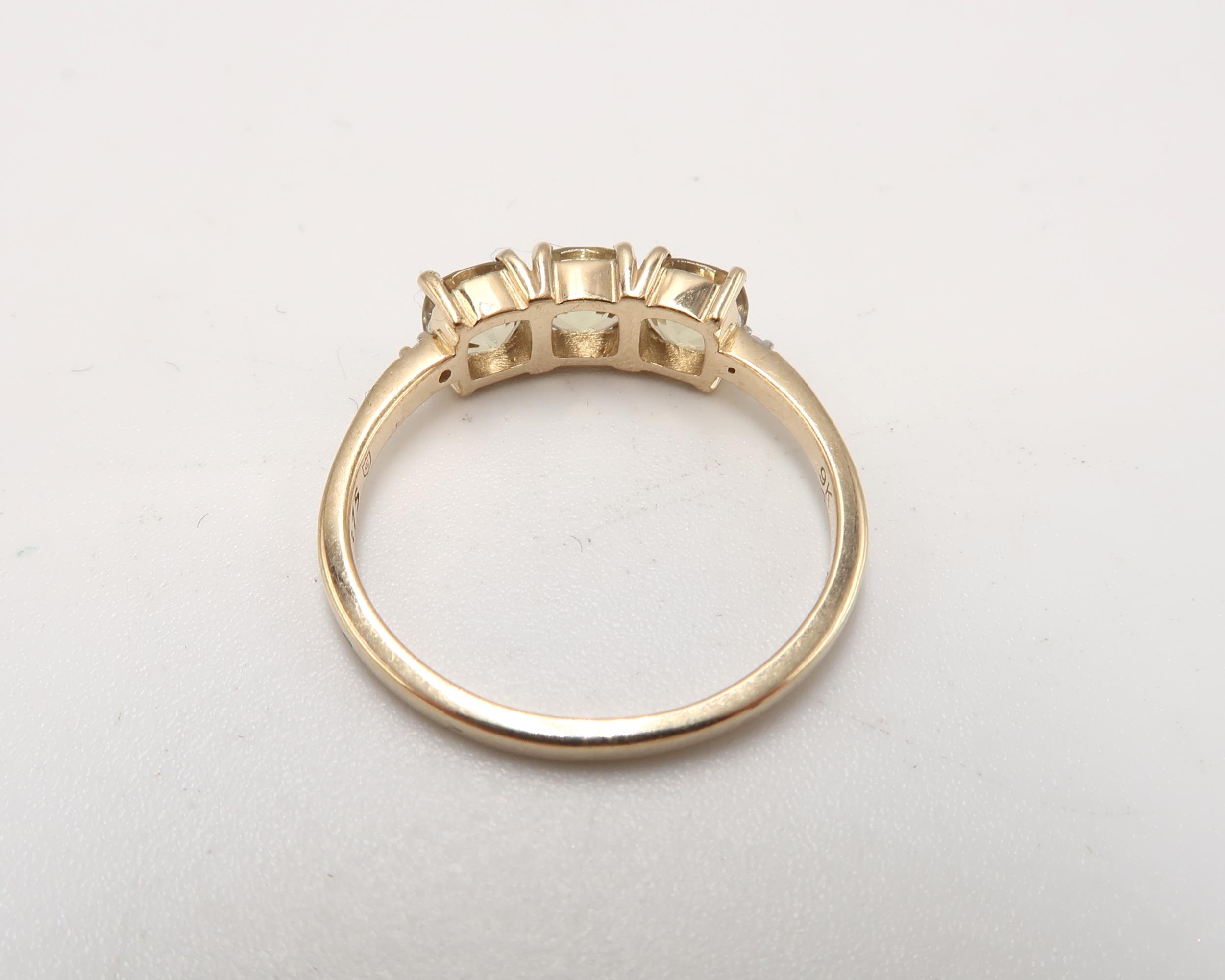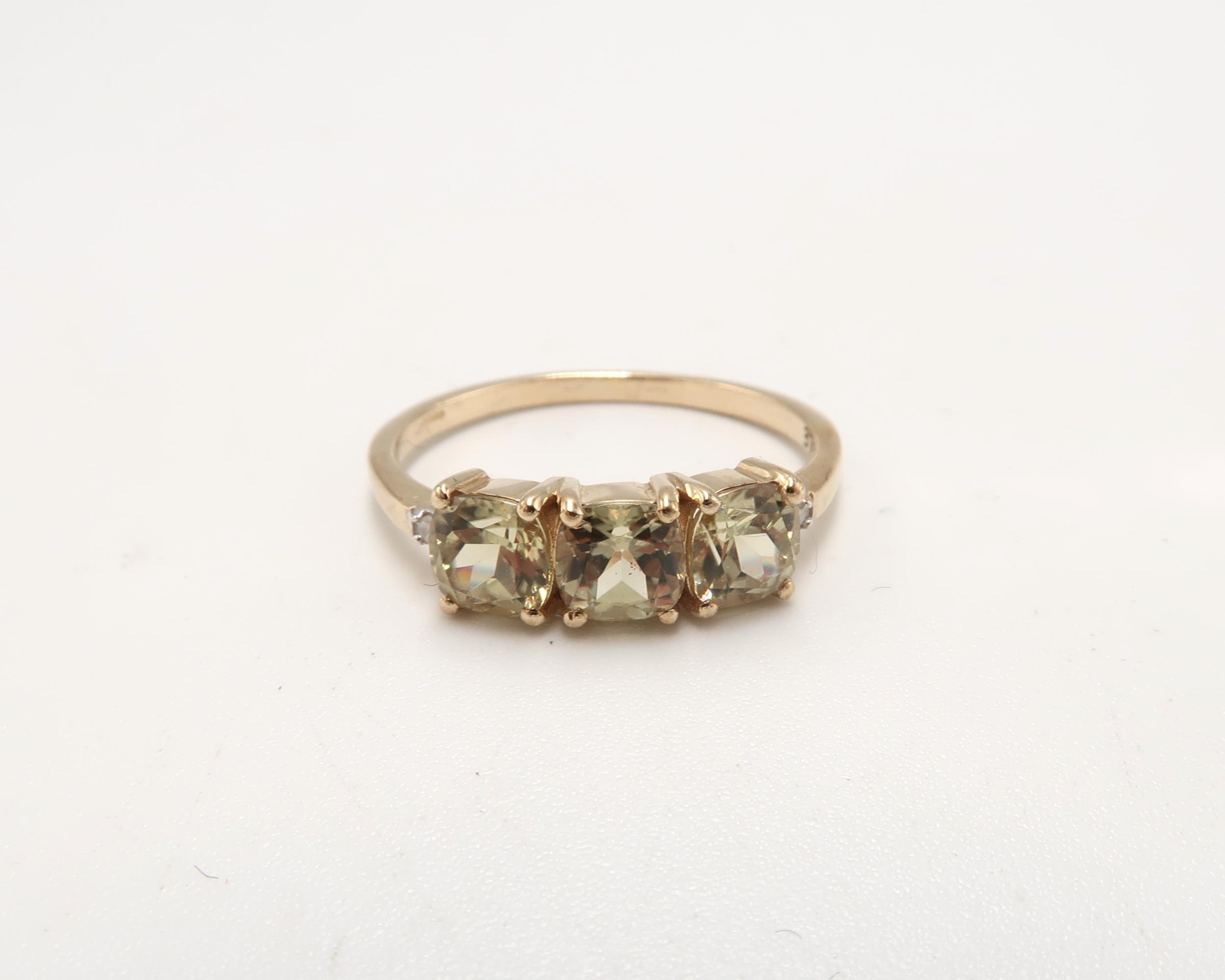 A 9ct Yellow Gold 3 Stone Dispore and Diamond Ring, Head Size approx. 15mm x 6mm - Ring Size approx. R/S