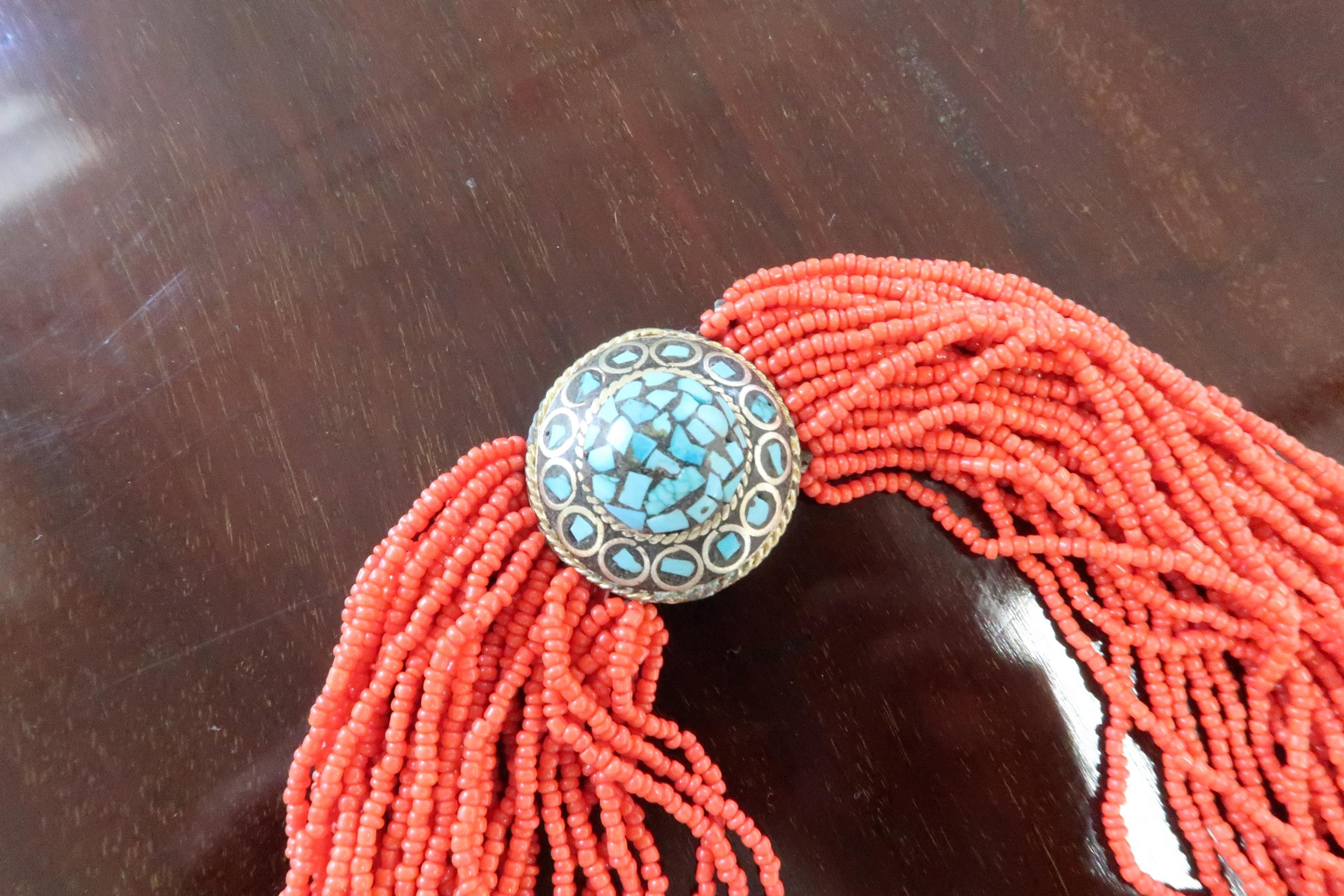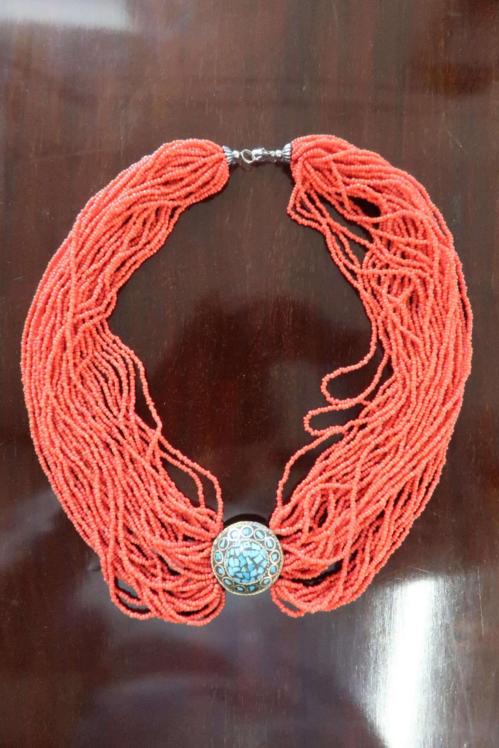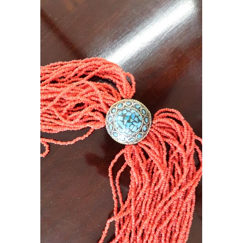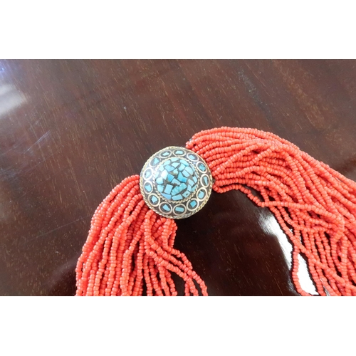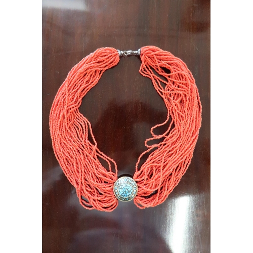 A Vintage Coral Bead Necklace with approx. 5000 plus Coral Beads with an Inlaid Turquoise Pendant, Total Length approx. 50cms Long
