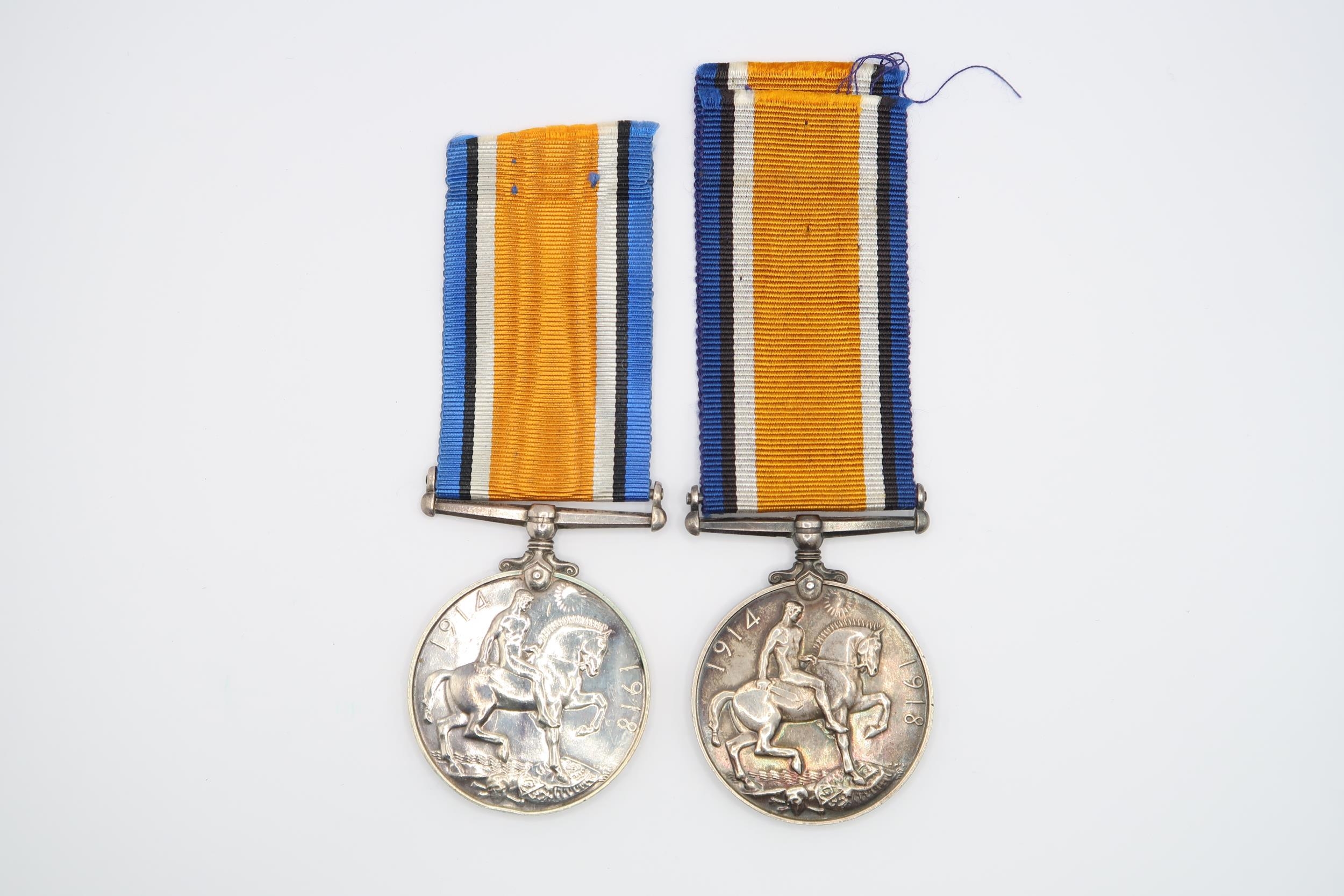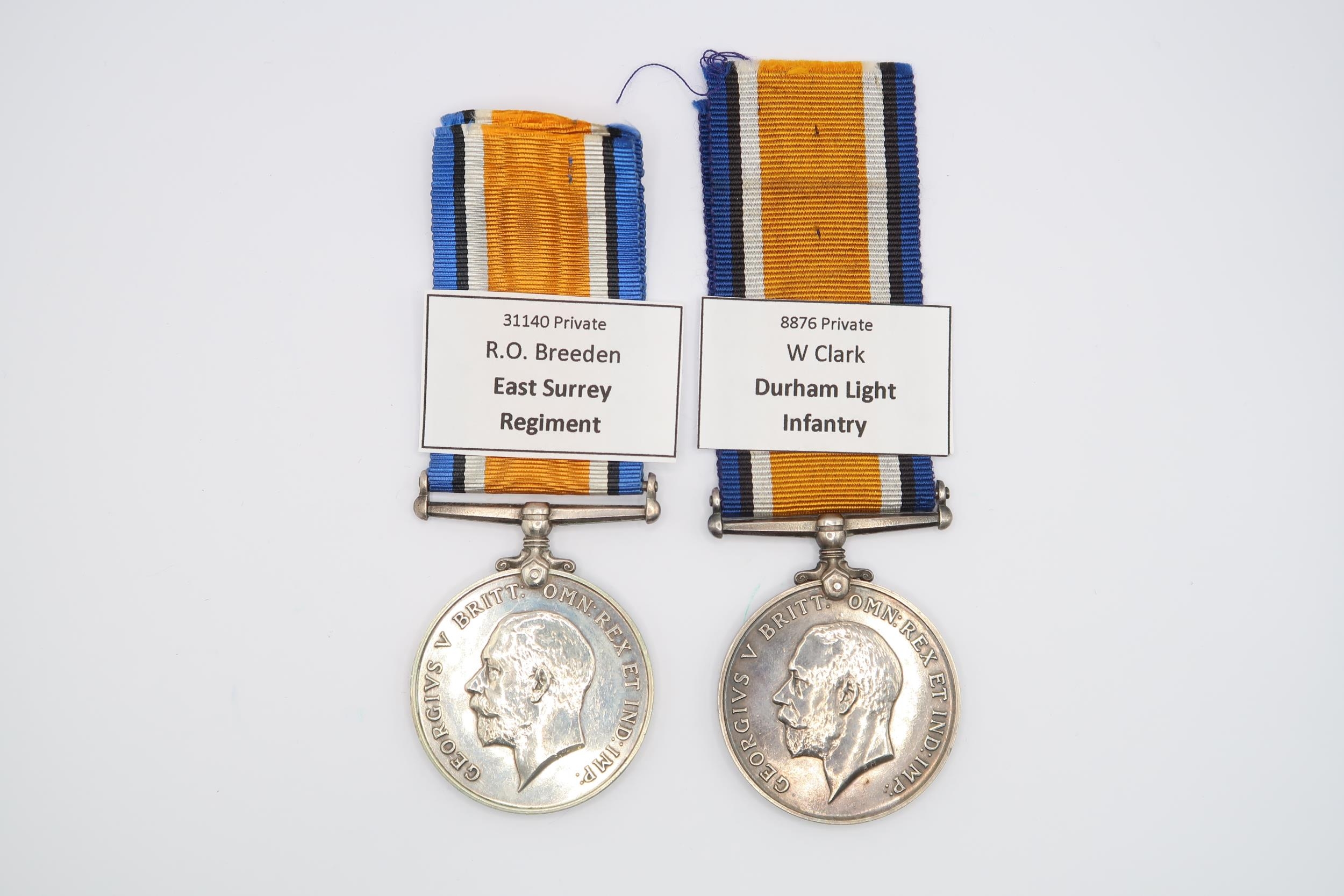 A Pair of British WW1 War Medal 1914 - 1918, Issued to W PTE. Clark 8876, Durham Light Infantry Together with another issued to PTE. Robert O Breeden 31140, East Surrey Regiment.