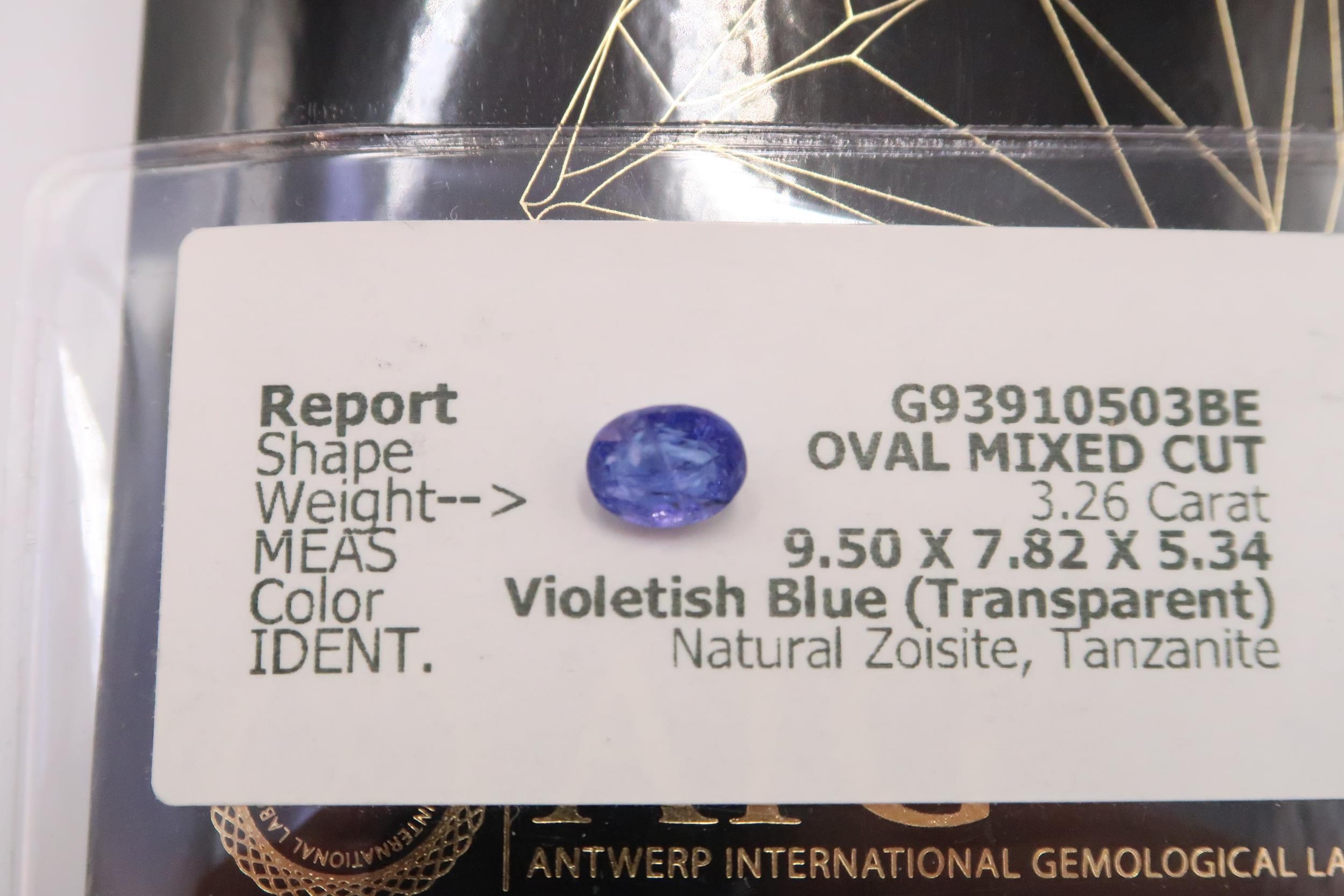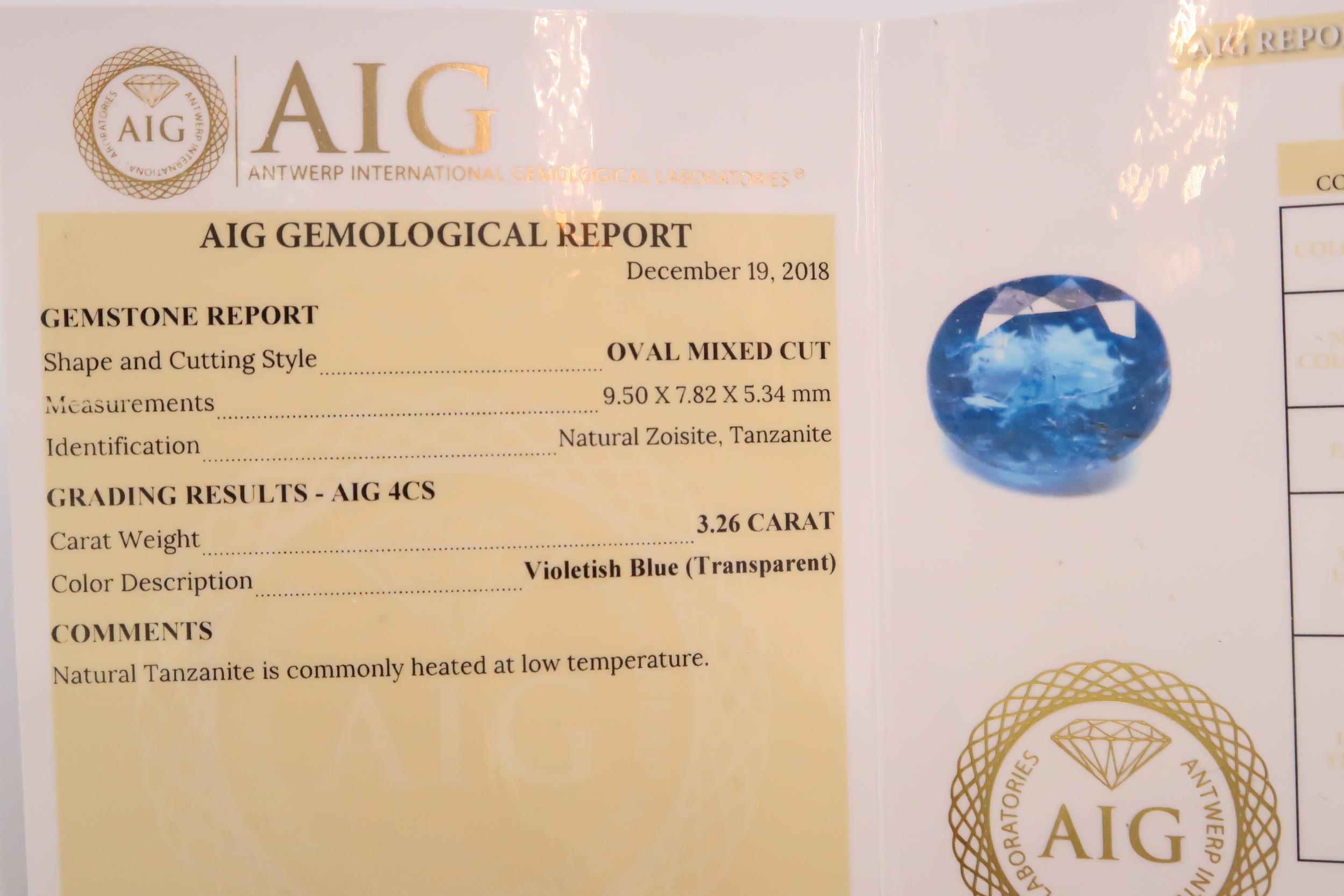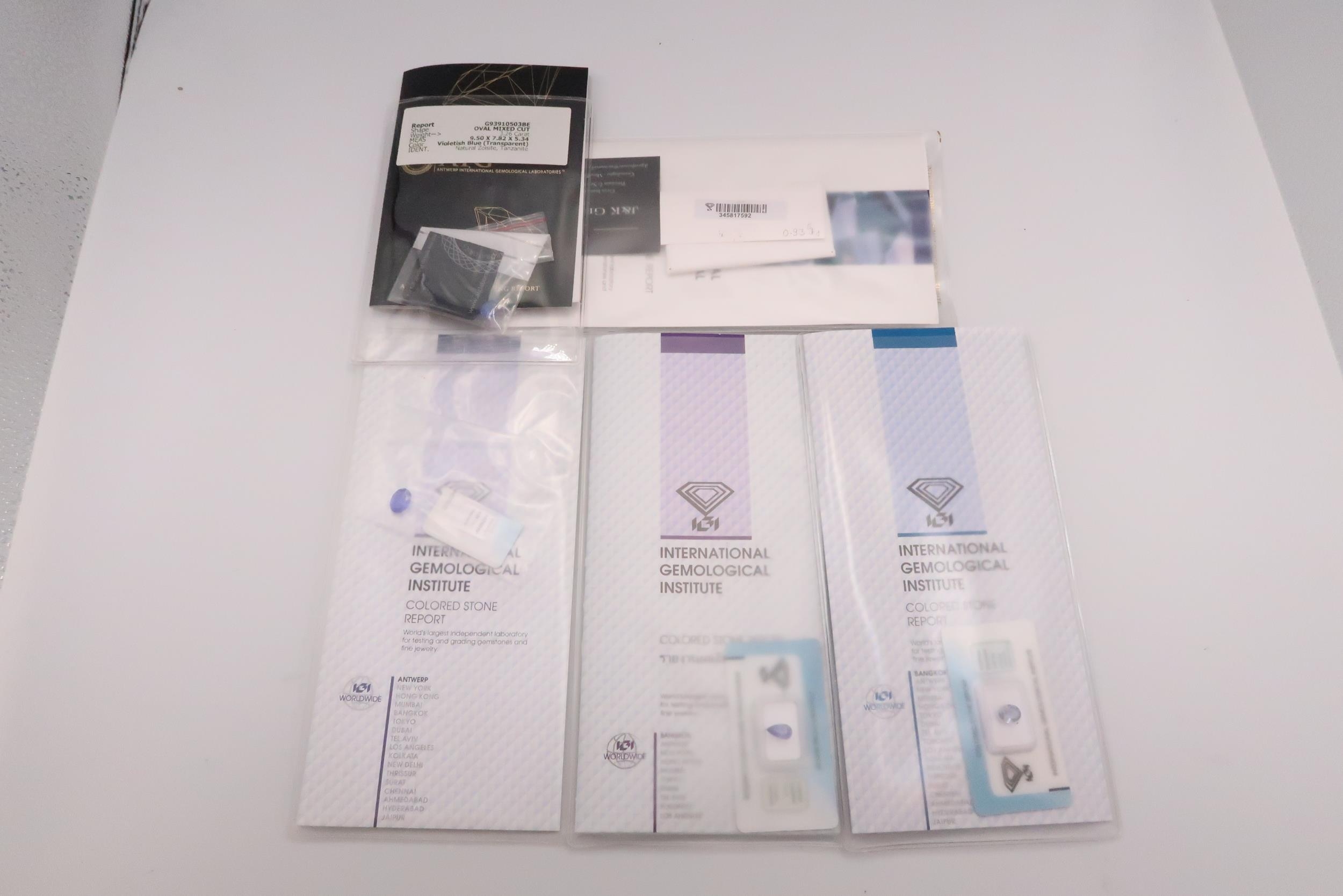 Five loose tanzanite/zoisite gemstones. To include an oval cut with AIG report stating 3.26 cts. A pear cut with IGI report stating 0.93cts. A pear cut with IGI report stating 1.81 cts. An oval cut with IGI report stating 4.09cts. Together with an oval cut of green violet colour with IGI certificate stating 2.33cts.