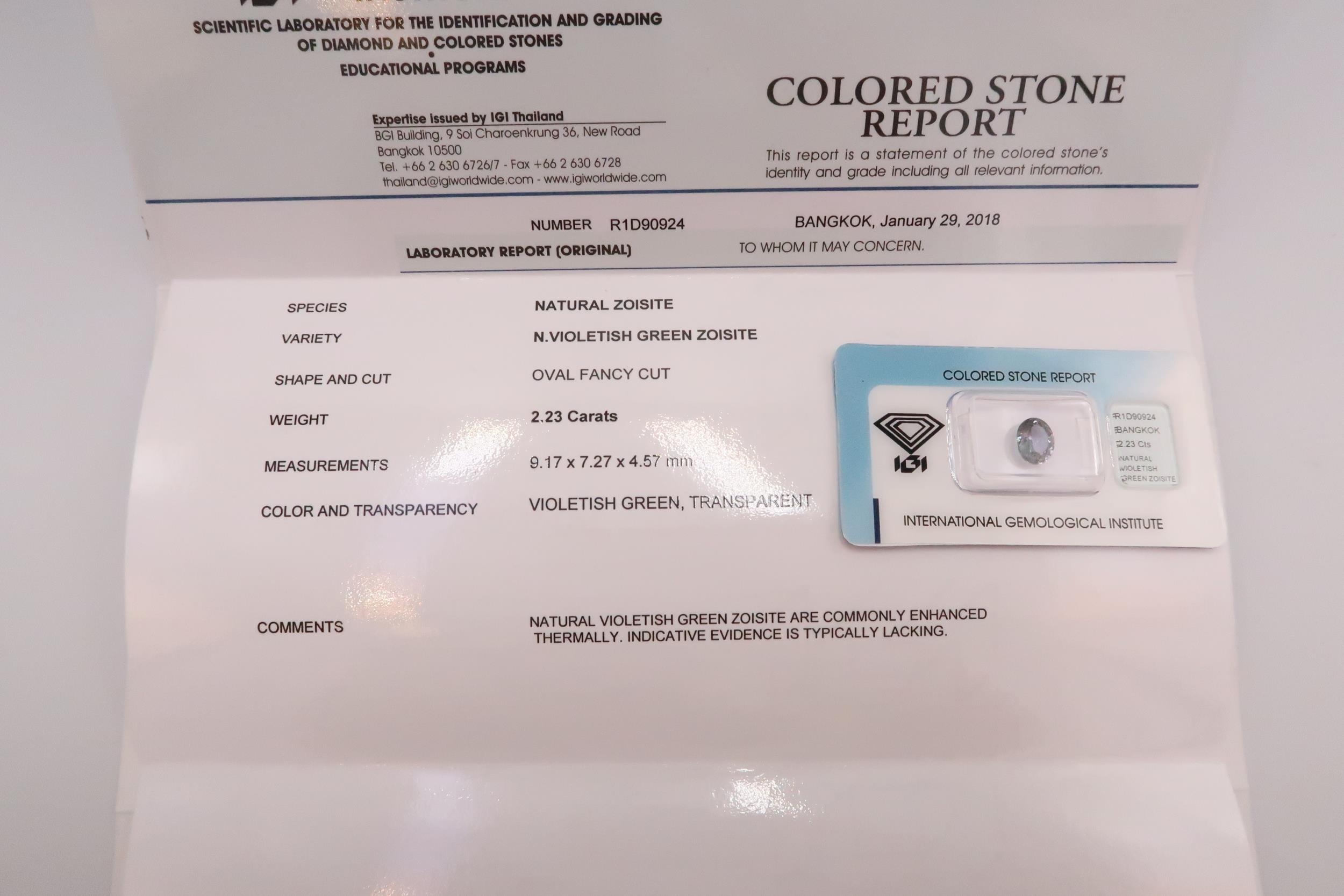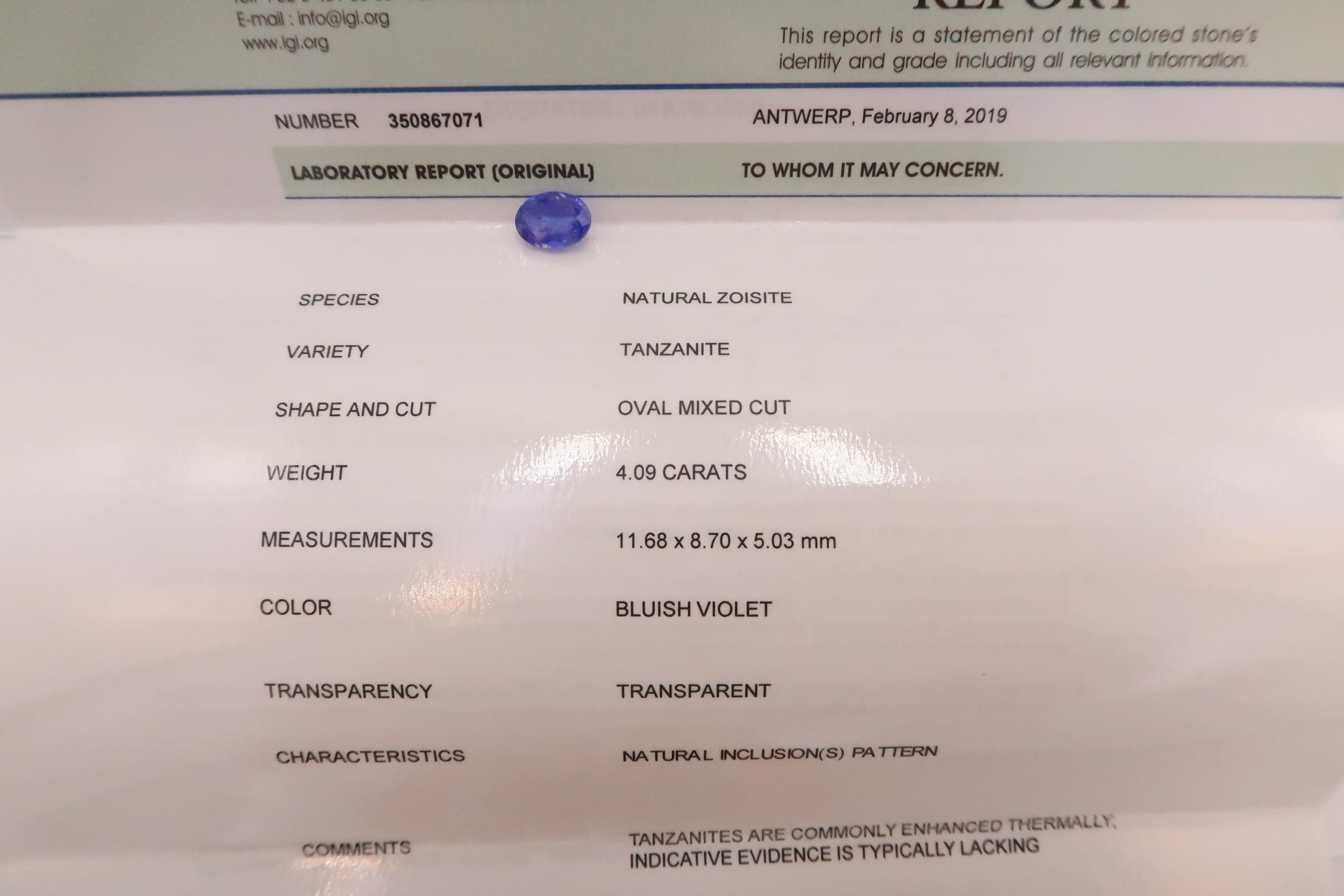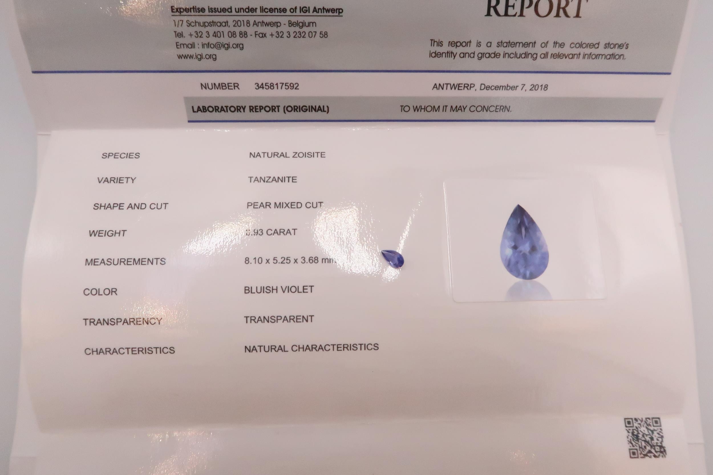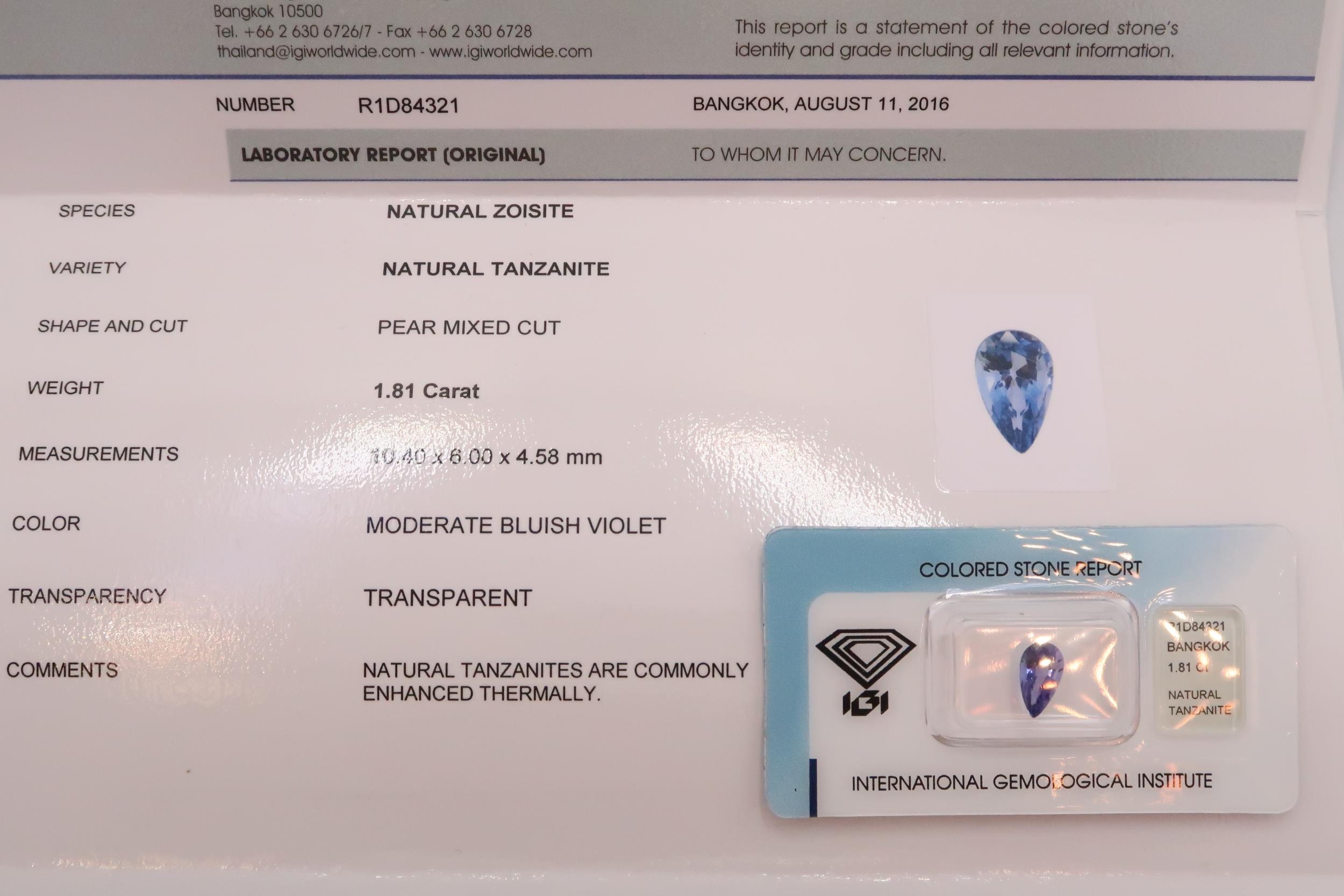 Five loose tanzanite/zoisite gemstones. To include an oval cut with AIG report stating 3.26 cts. A pear cut with IGI report stating 0.93cts. A pear cut with IGI report stating 1.81 cts. An oval cut with IGI report stating 4.09cts. Together with an oval cut of green violet colour with IGI certificate stating 2.33cts.