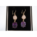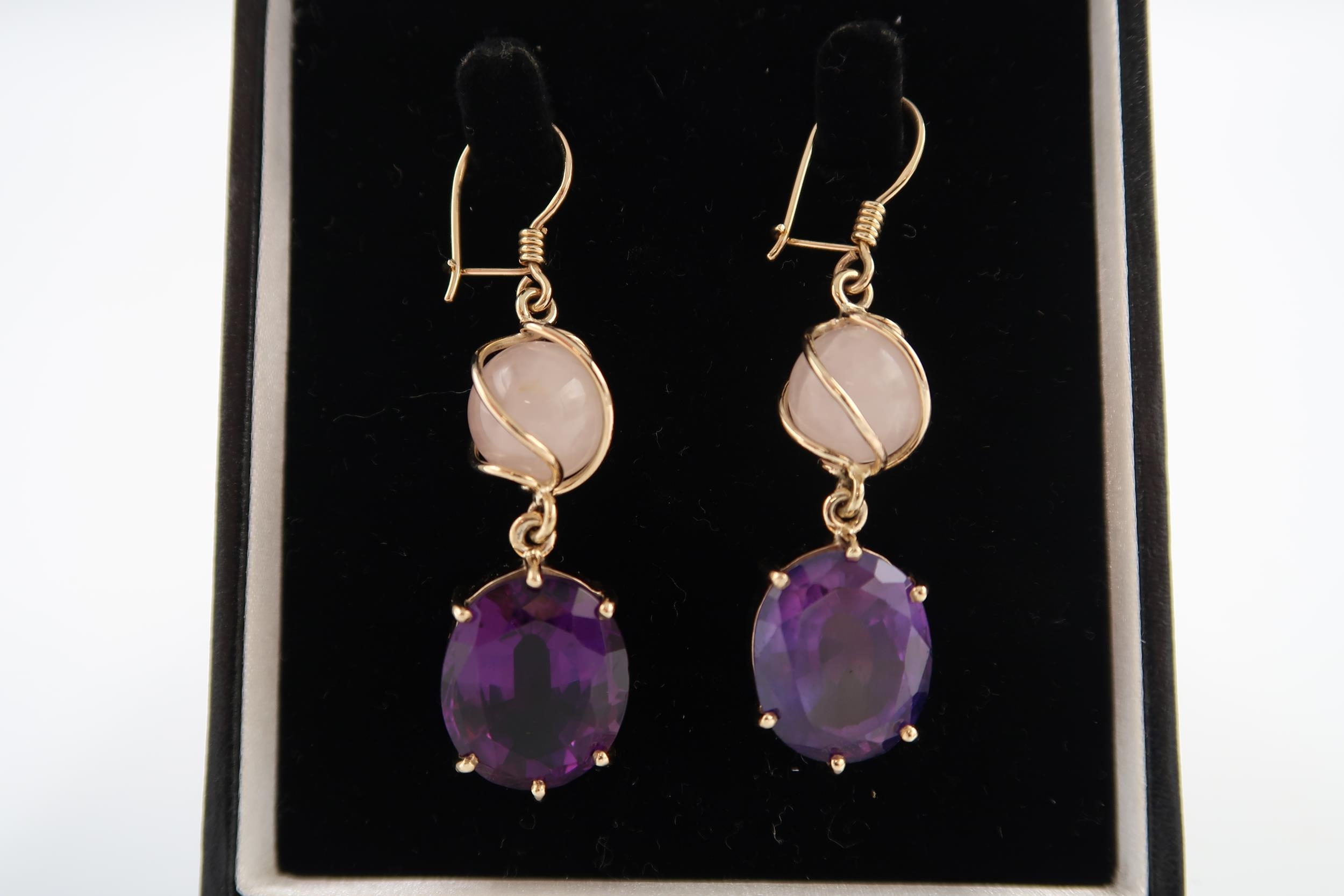 A 9ct yellow gold pair of large amethyst and rose quartz earrings, amethyst approx 18mm x 13mm, rose quartz approx 10mm diameter, length approx 34mm long not including the ear pendants