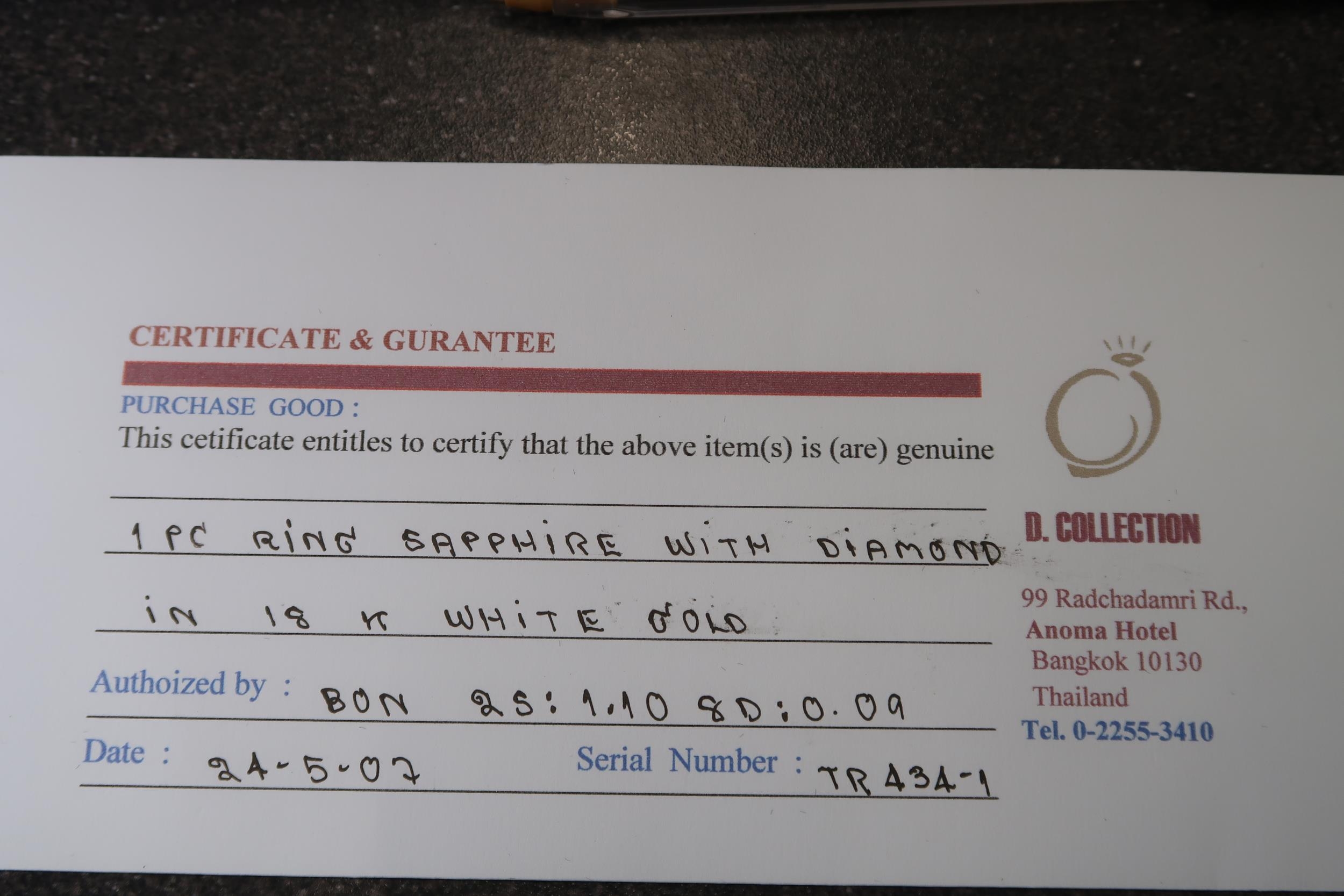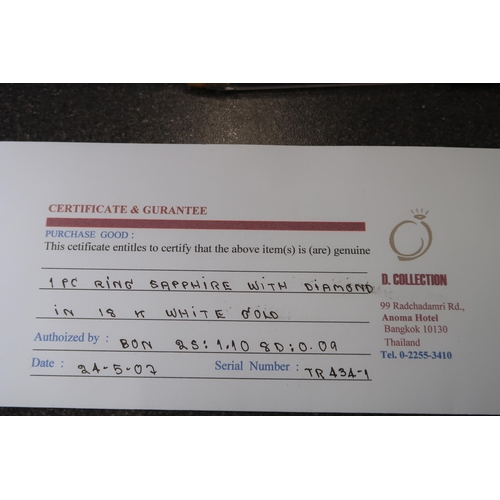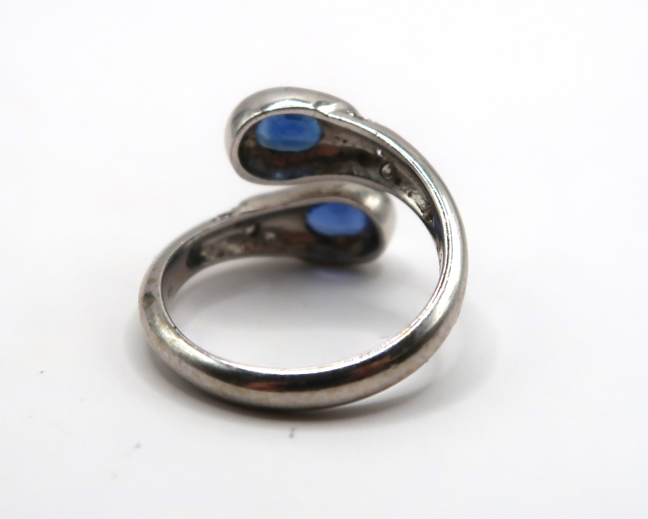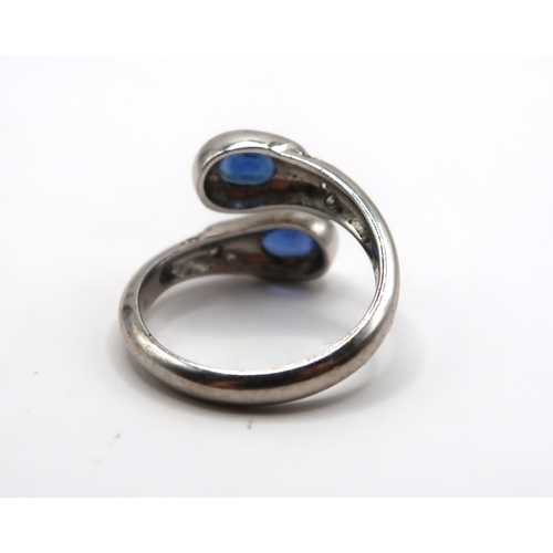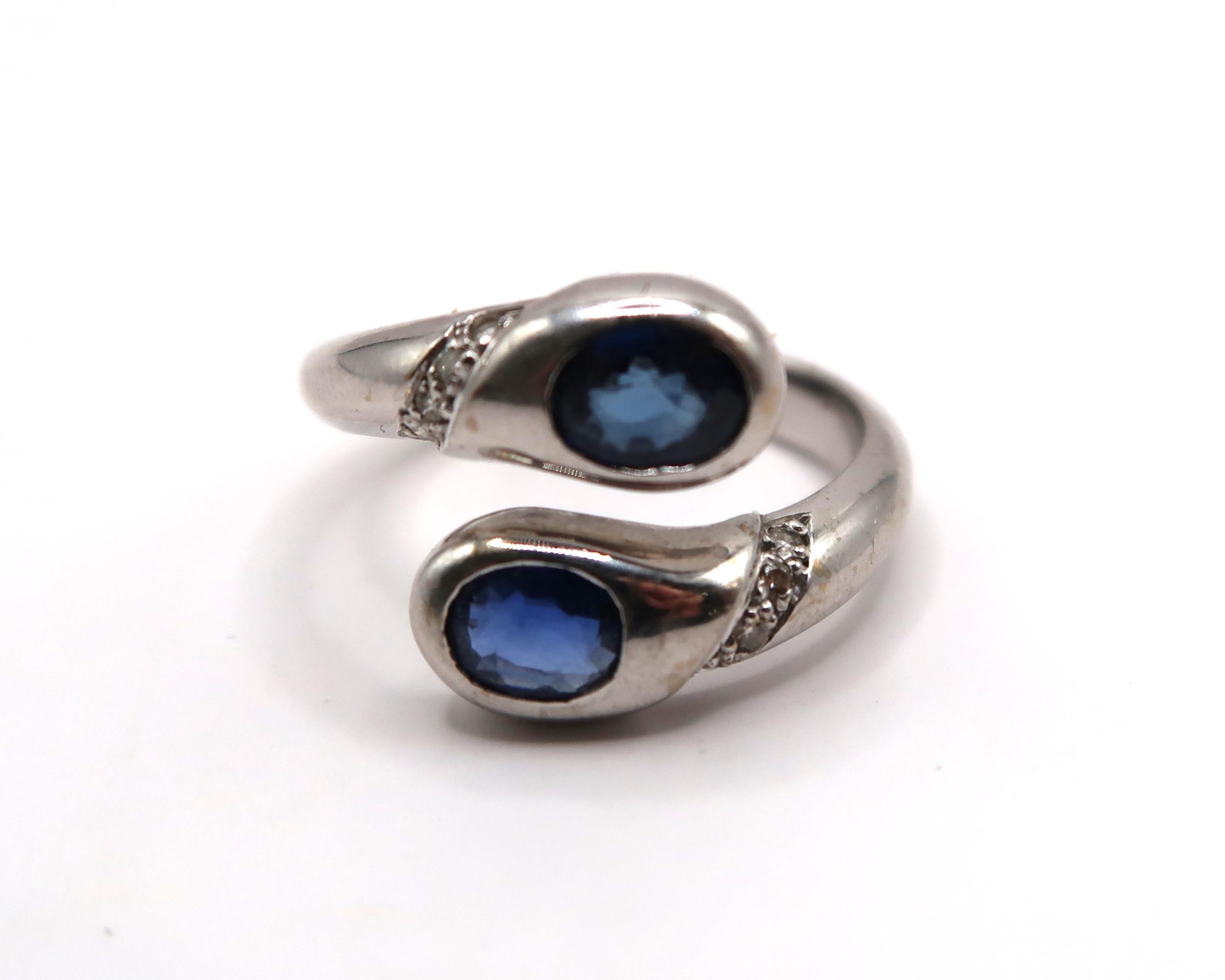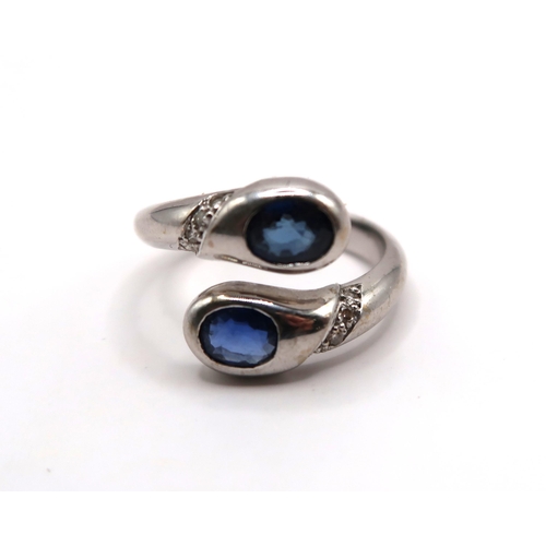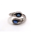 An 18ct white gold, sapphire and diamond double snake headed ring, each head set with single oval cut mid blue sapphire with collar of four diamonds, complete with certificate and guarantee, size M, 5.9g.