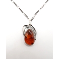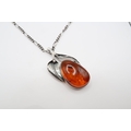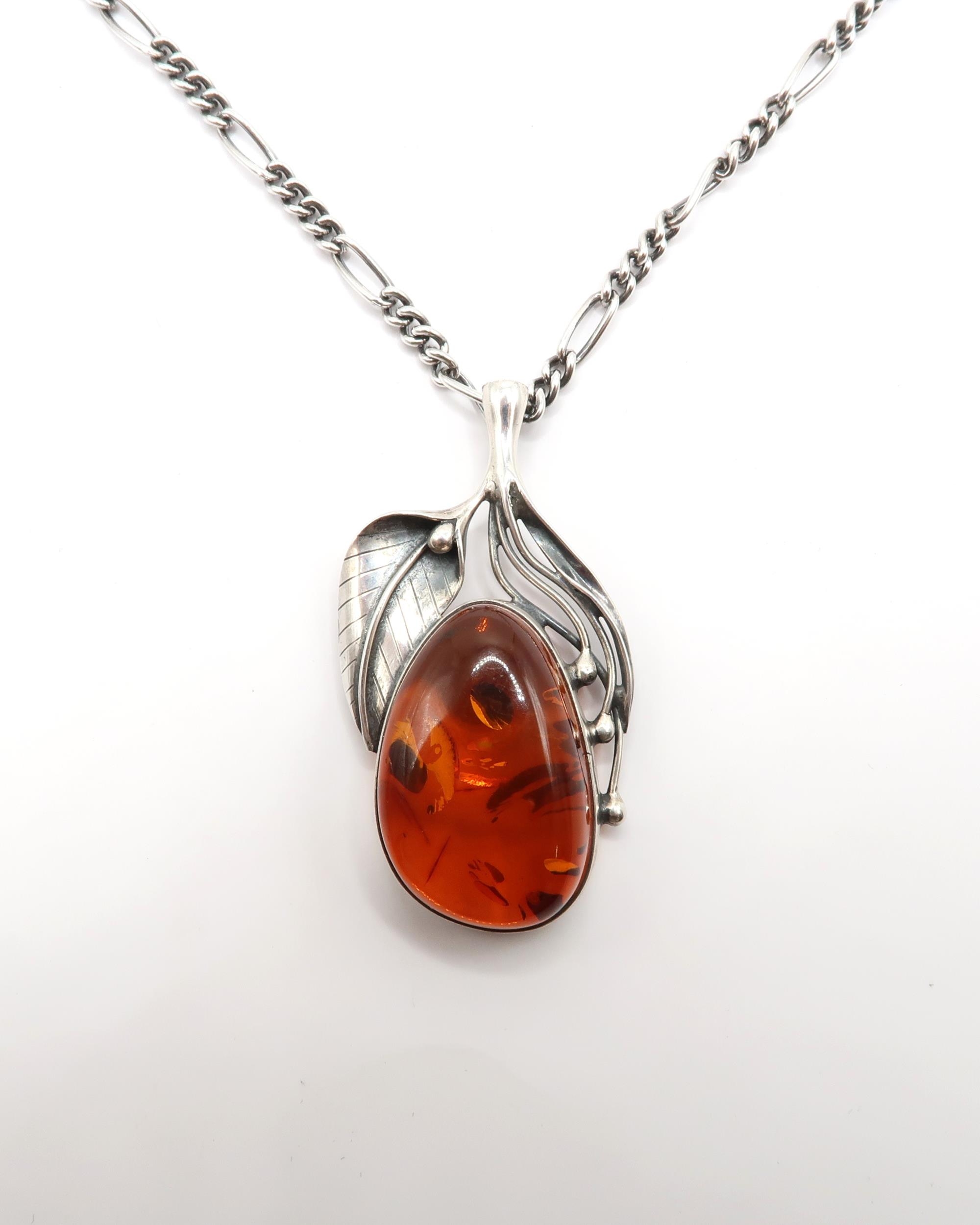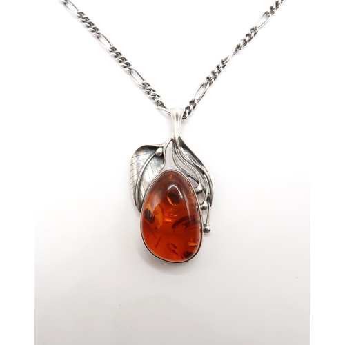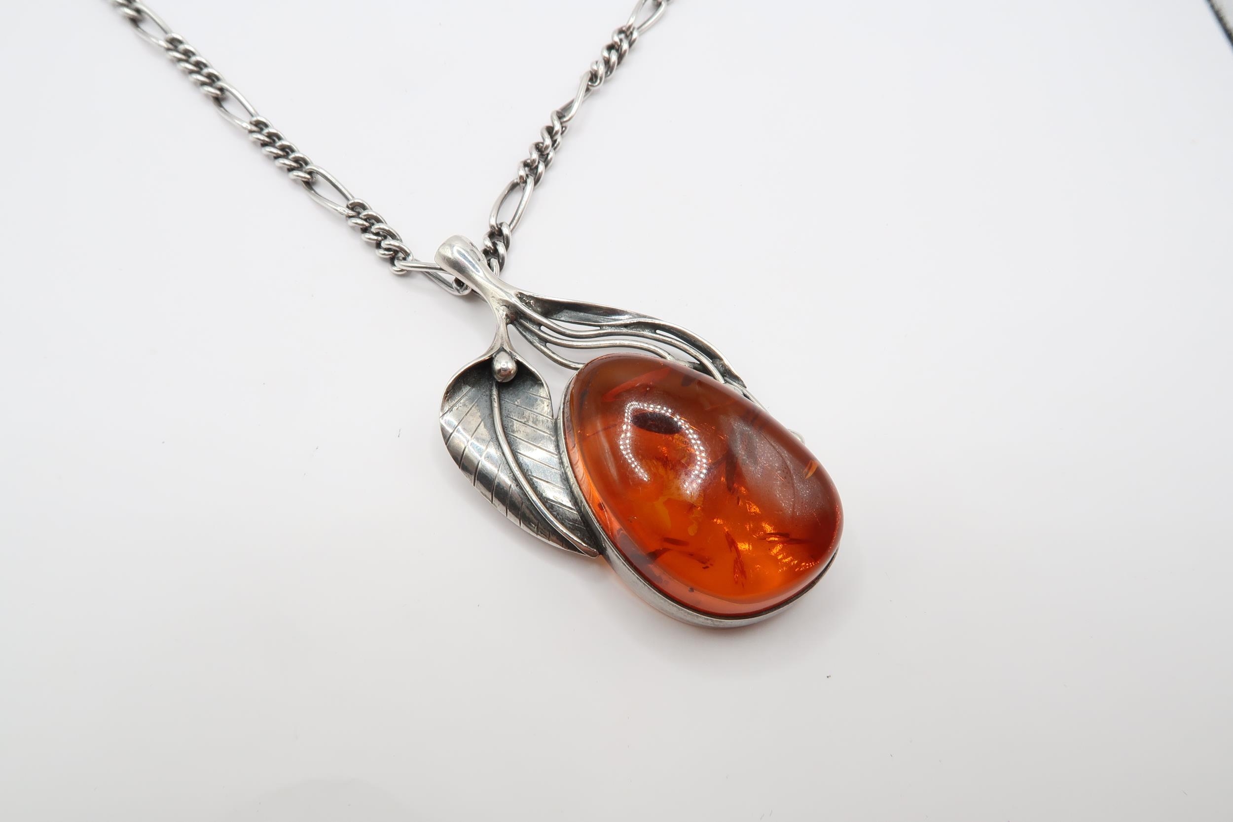 A Vintage Art Nouveau Style Large Amber and Silver Pendant and Silver Chain, Pendant Approx. 52mm x 29mm, Chain approx. 50cms Long