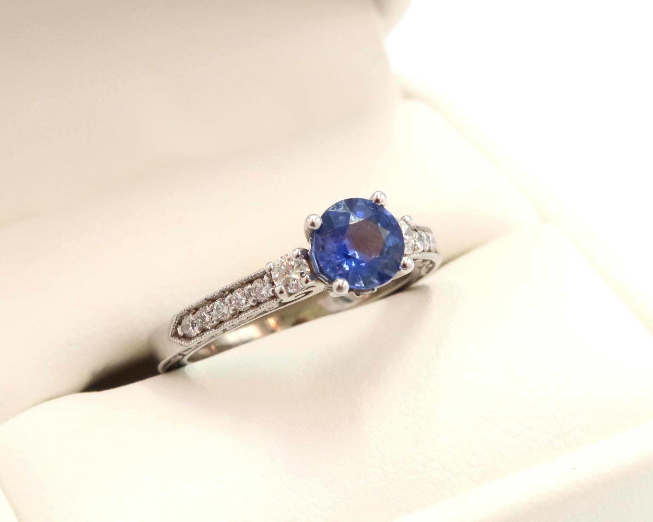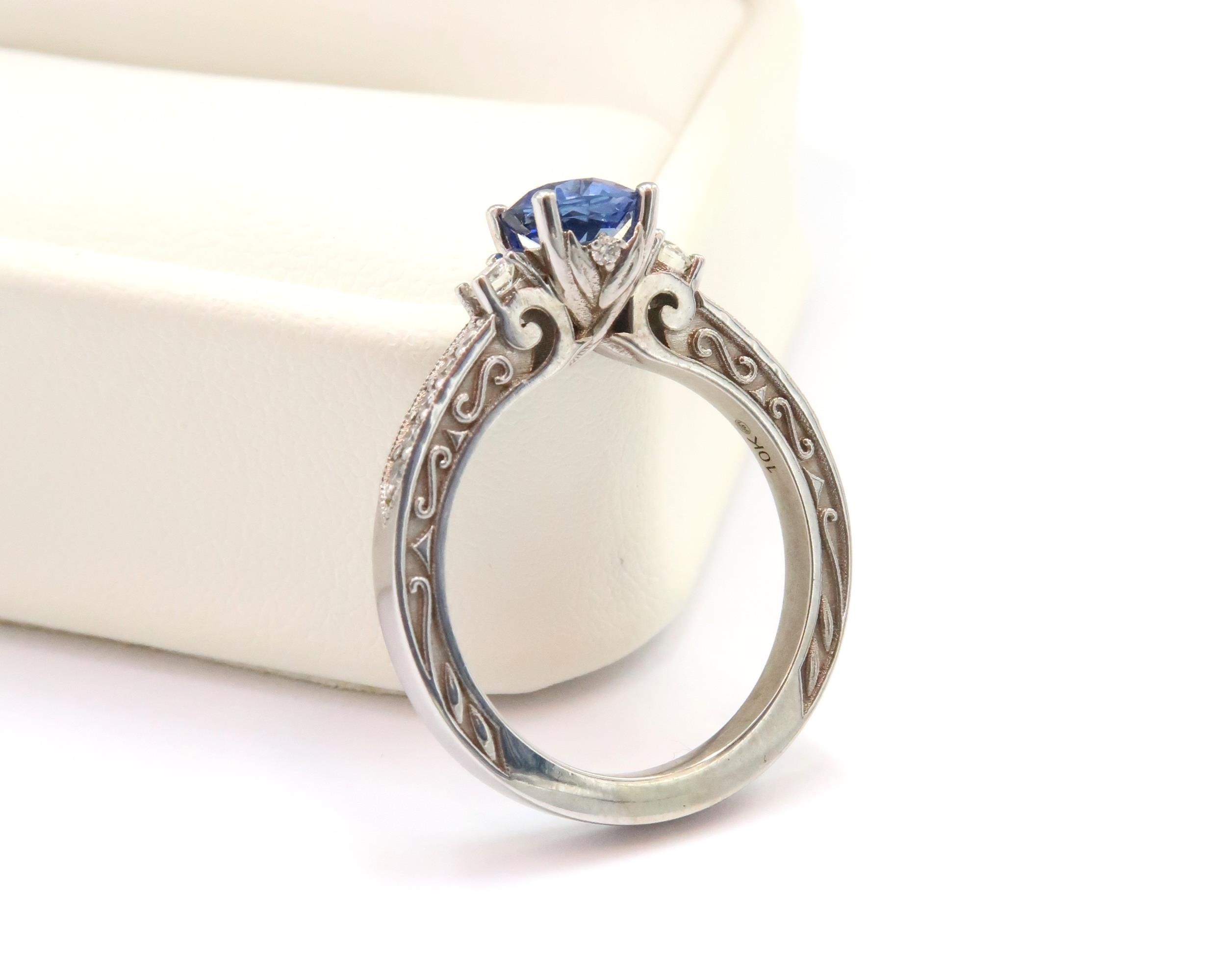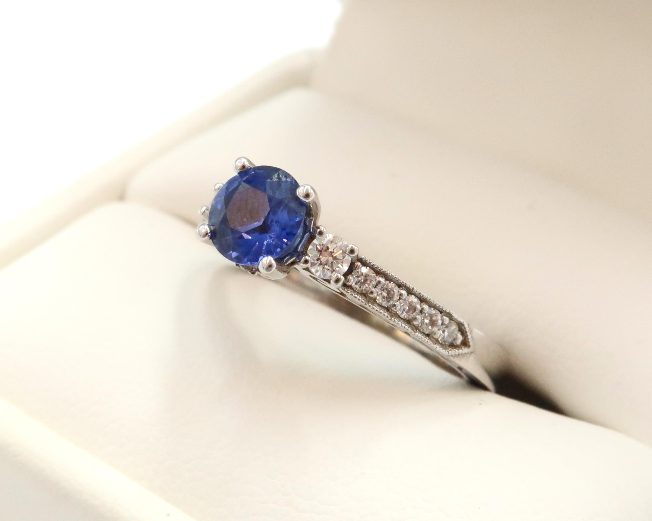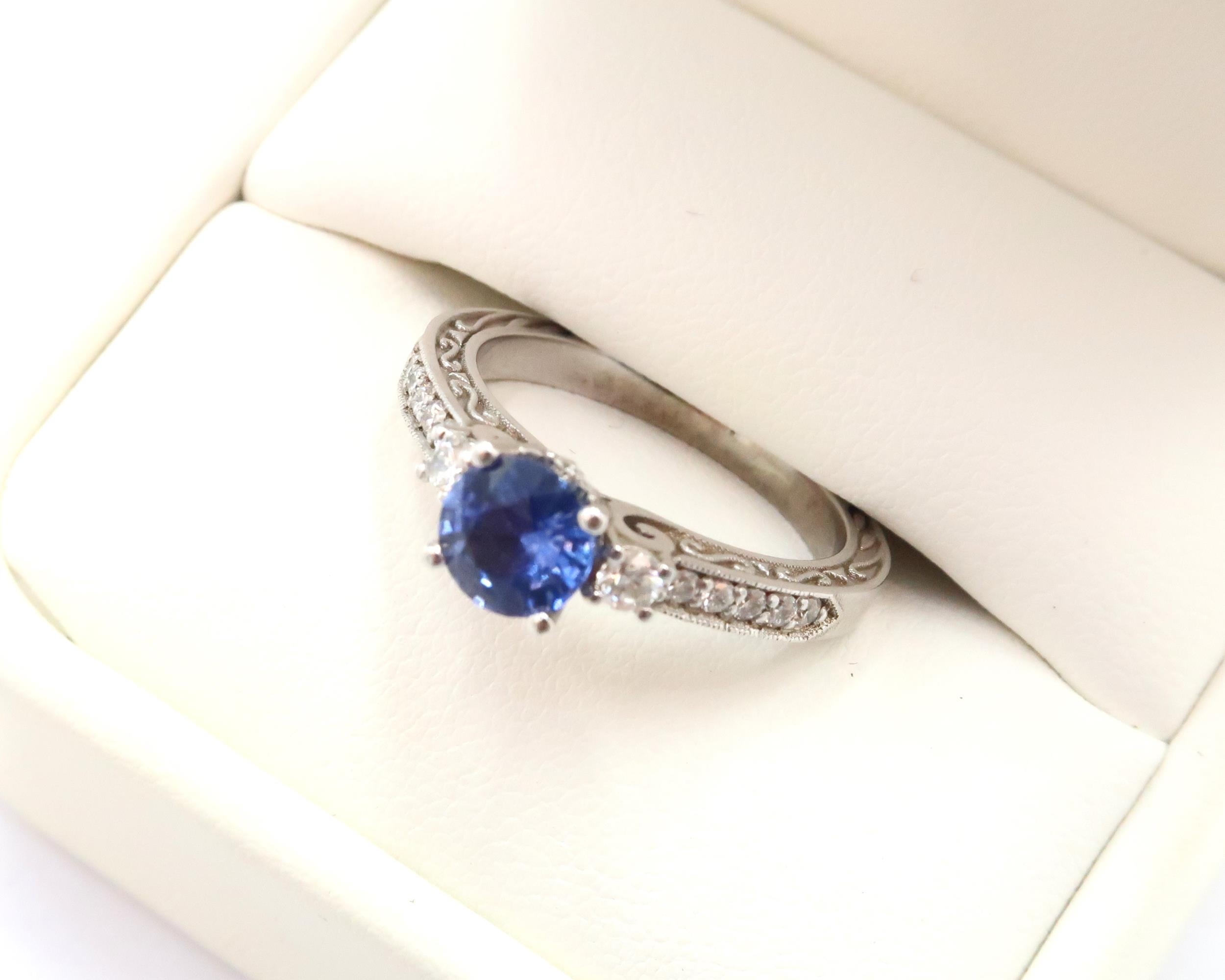 A 10ct gold Round Sapphire & Diamond ring. Diamond set shoulders and intricately designed side setting, .98ct vivid blue sapphire set together with 14 smaller round brilliant diamonds.