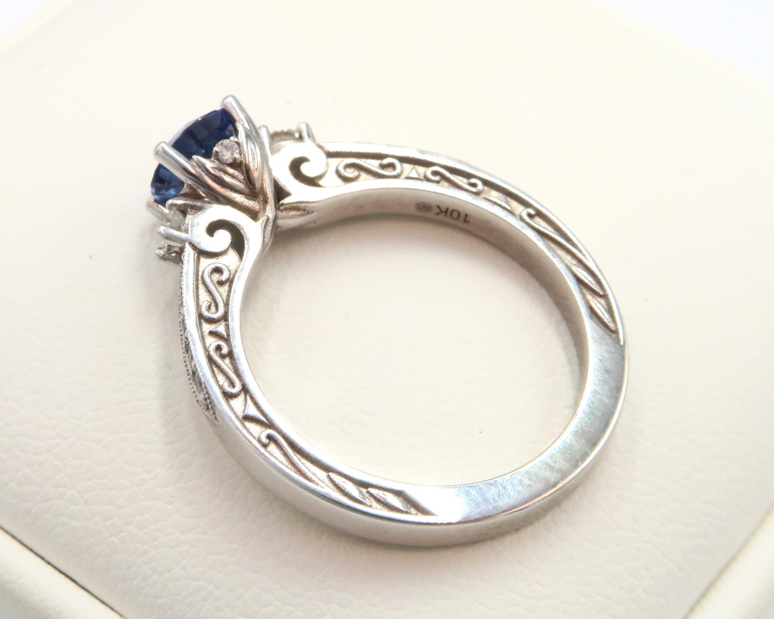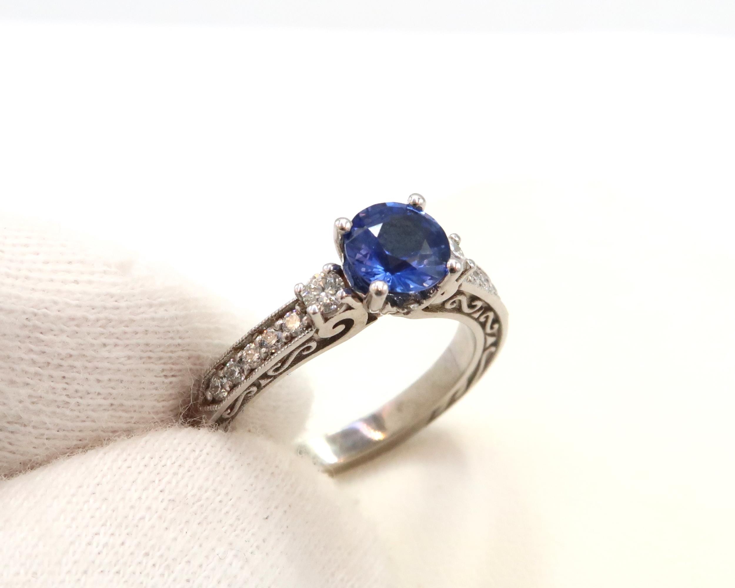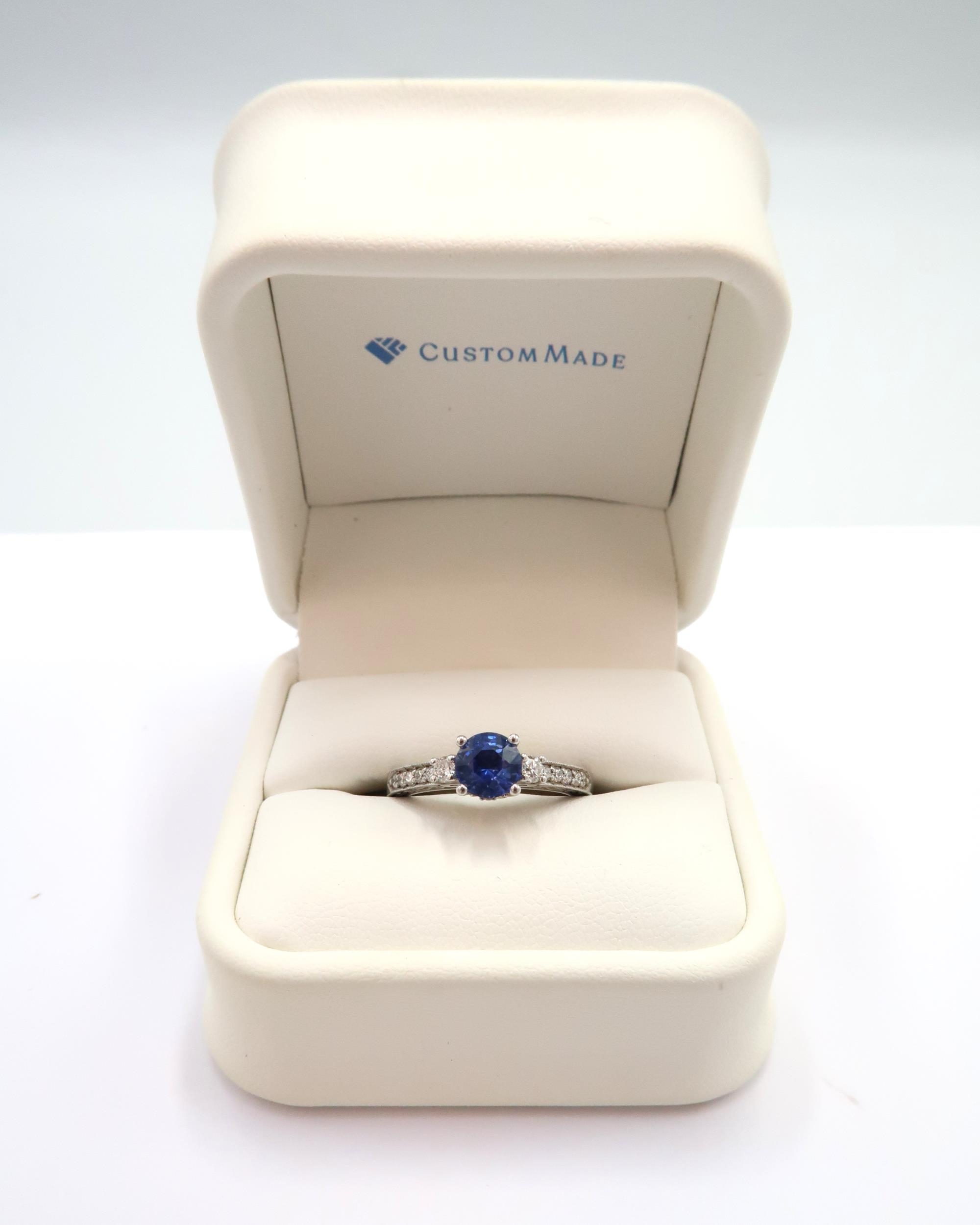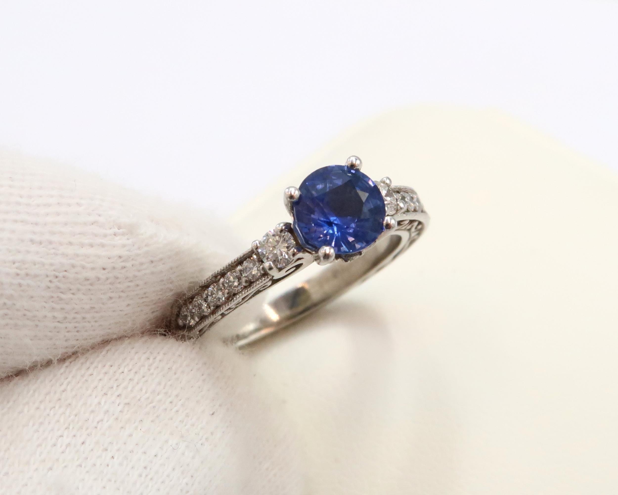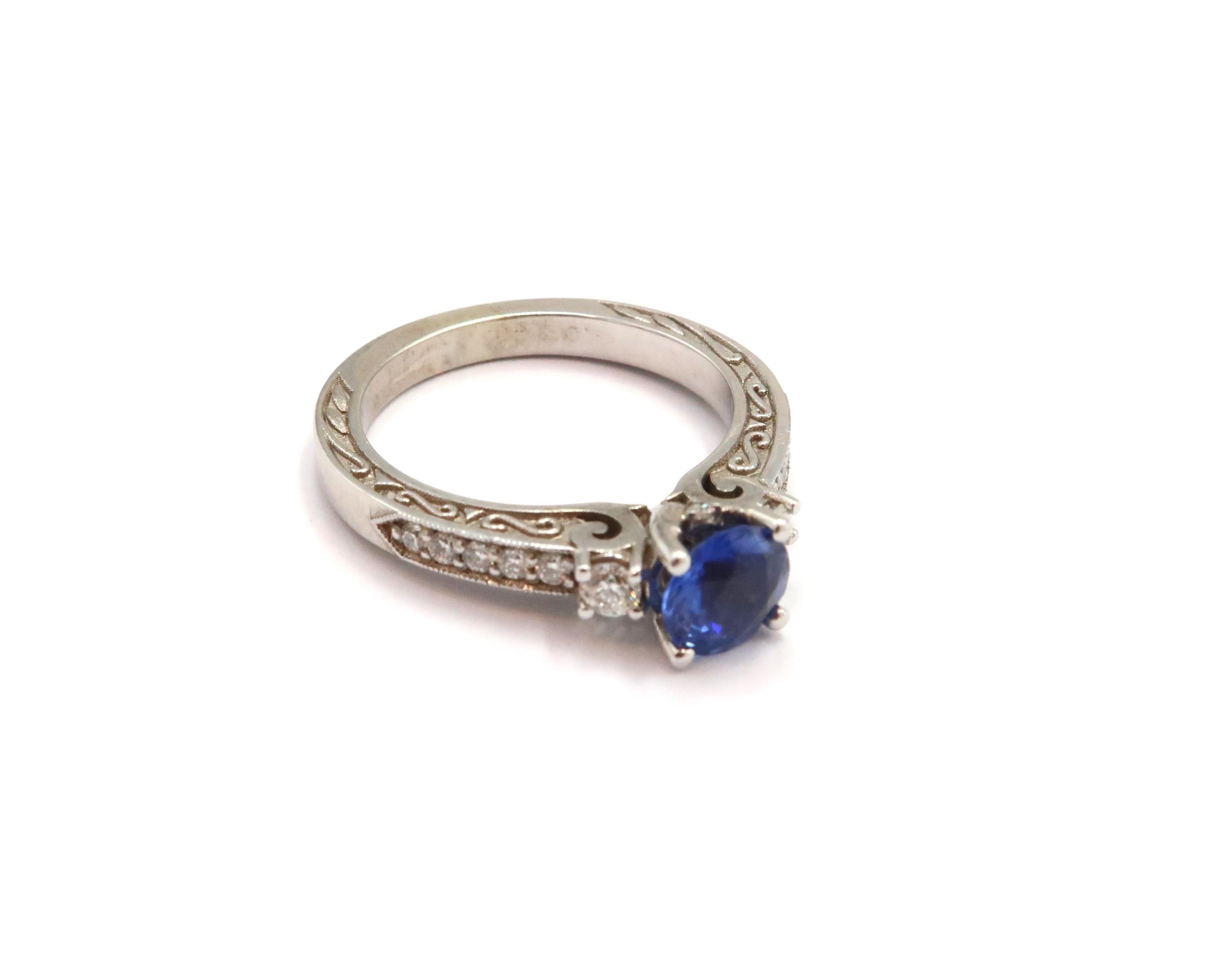 A 10ct gold Round Sapphire & Diamond ring. Diamond set shoulders and intricately designed side setting, .98ct vivid blue sapphire set together with 14 smaller round brilliant diamonds.