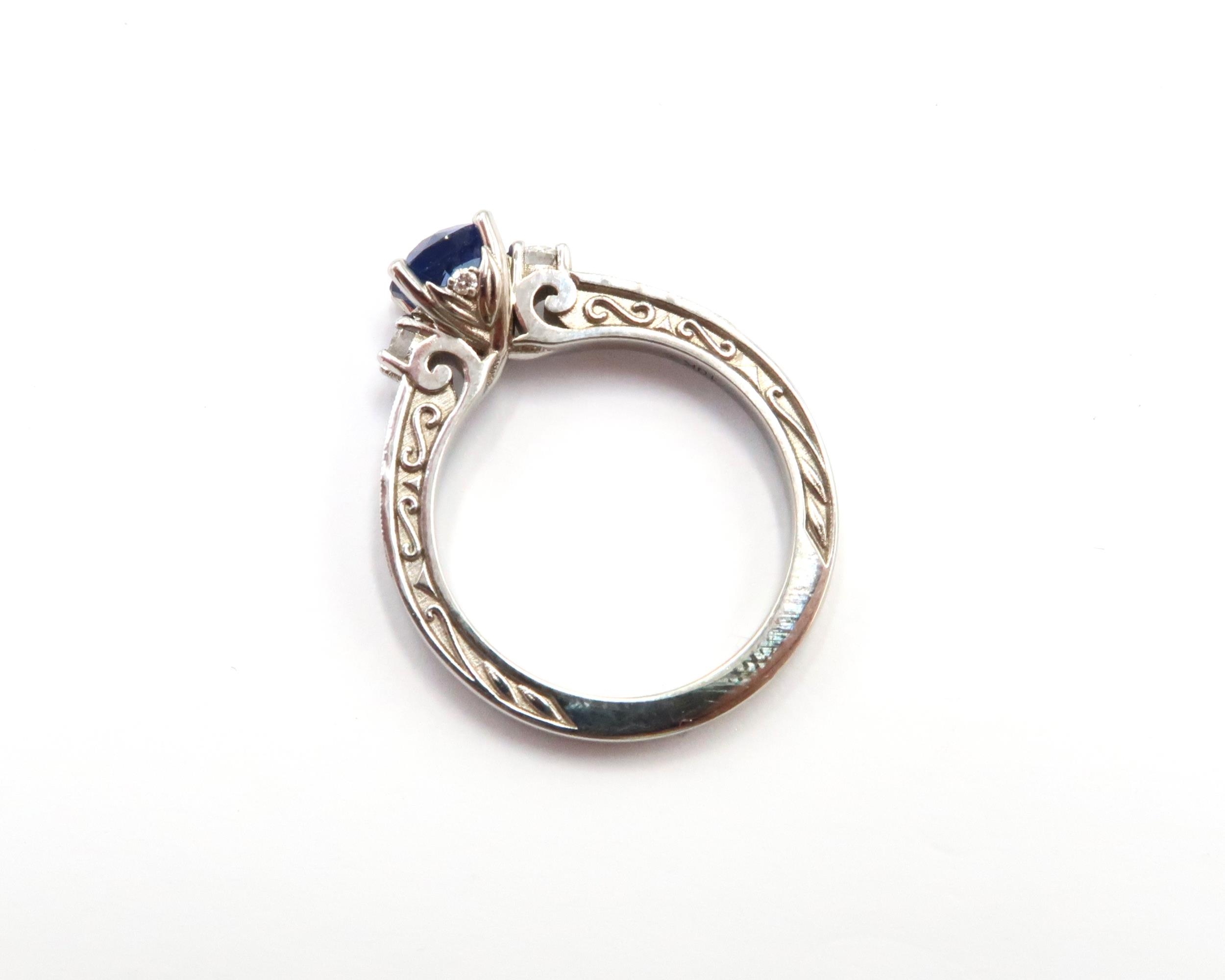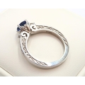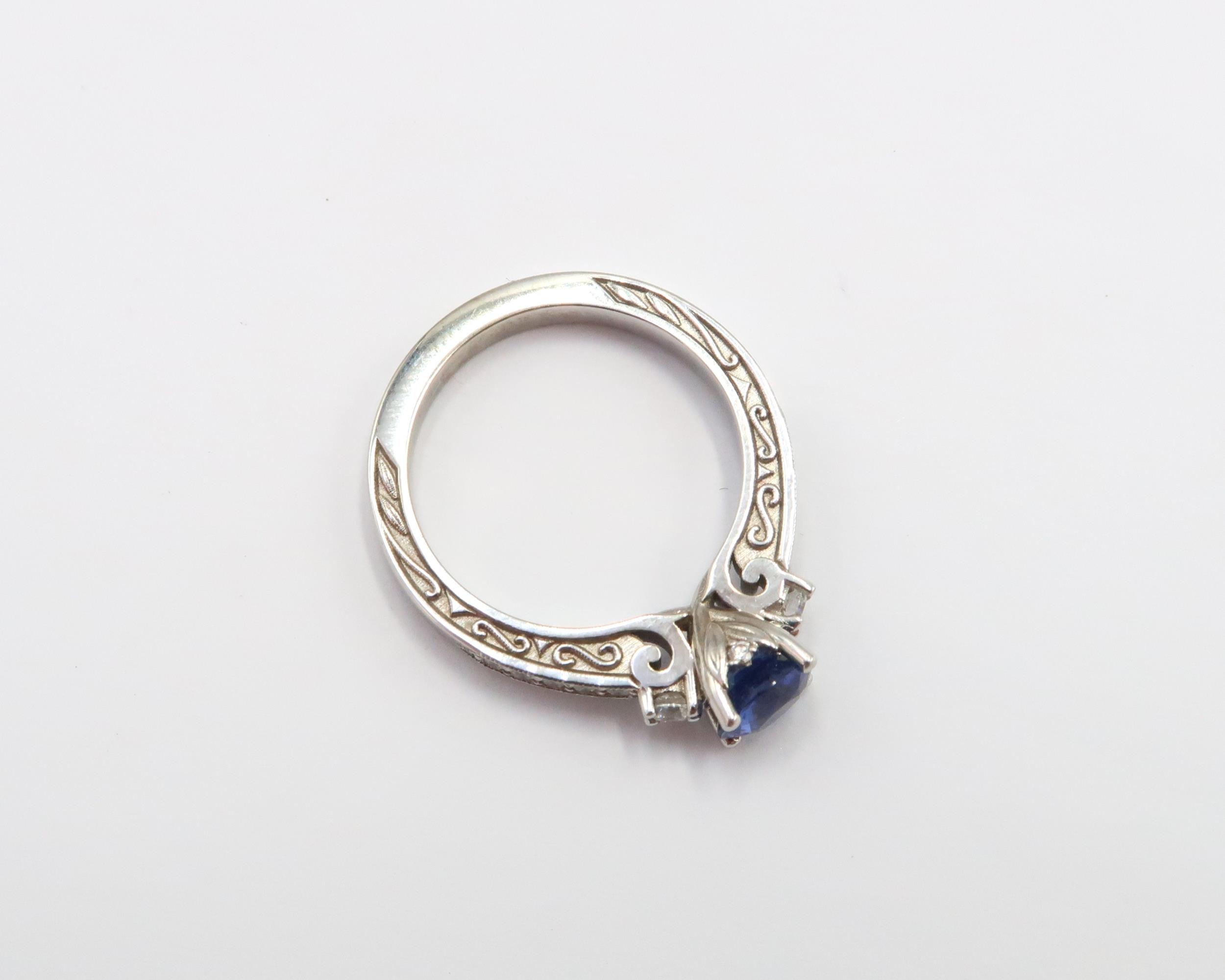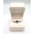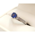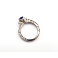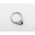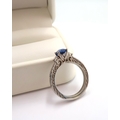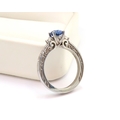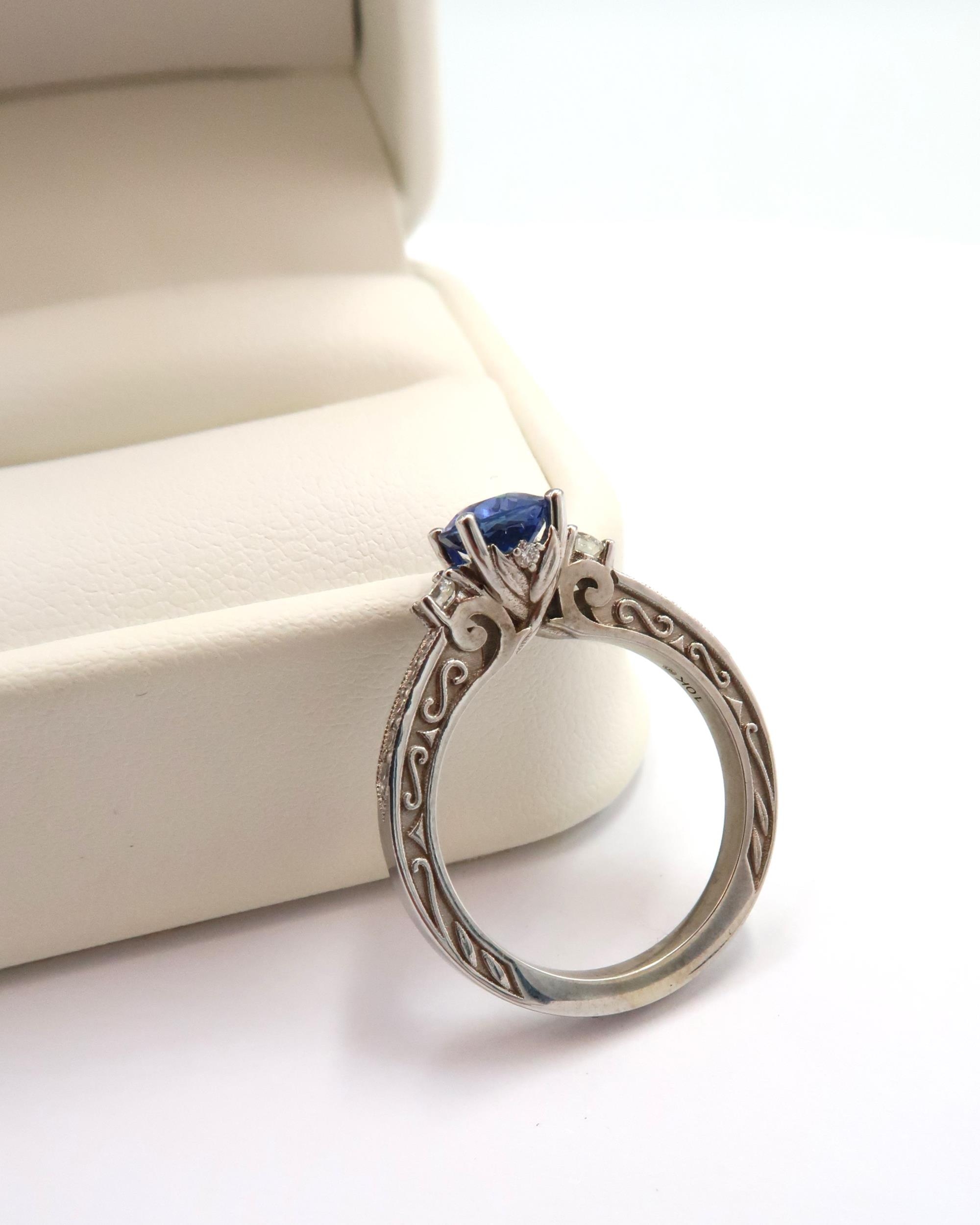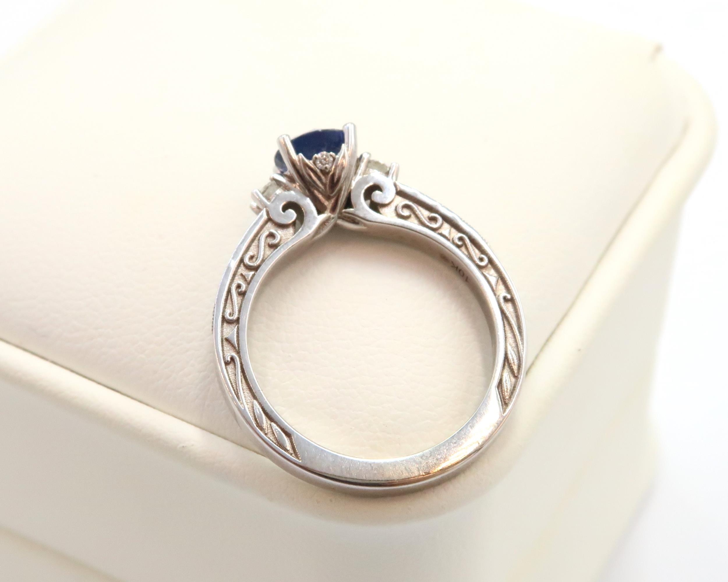 A 10ct gold Round Sapphire & Diamond ring. Diamond set shoulders and intricately designed side setting, .98ct vivid blue sapphire set together with 14 smaller round brilliant diamonds.