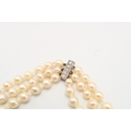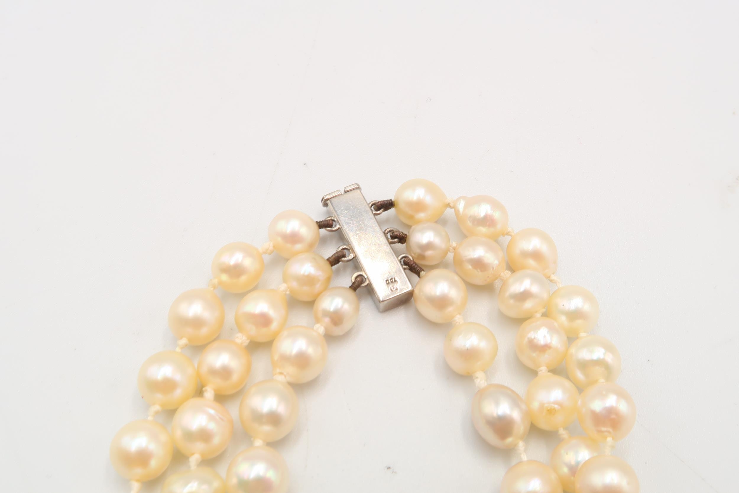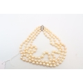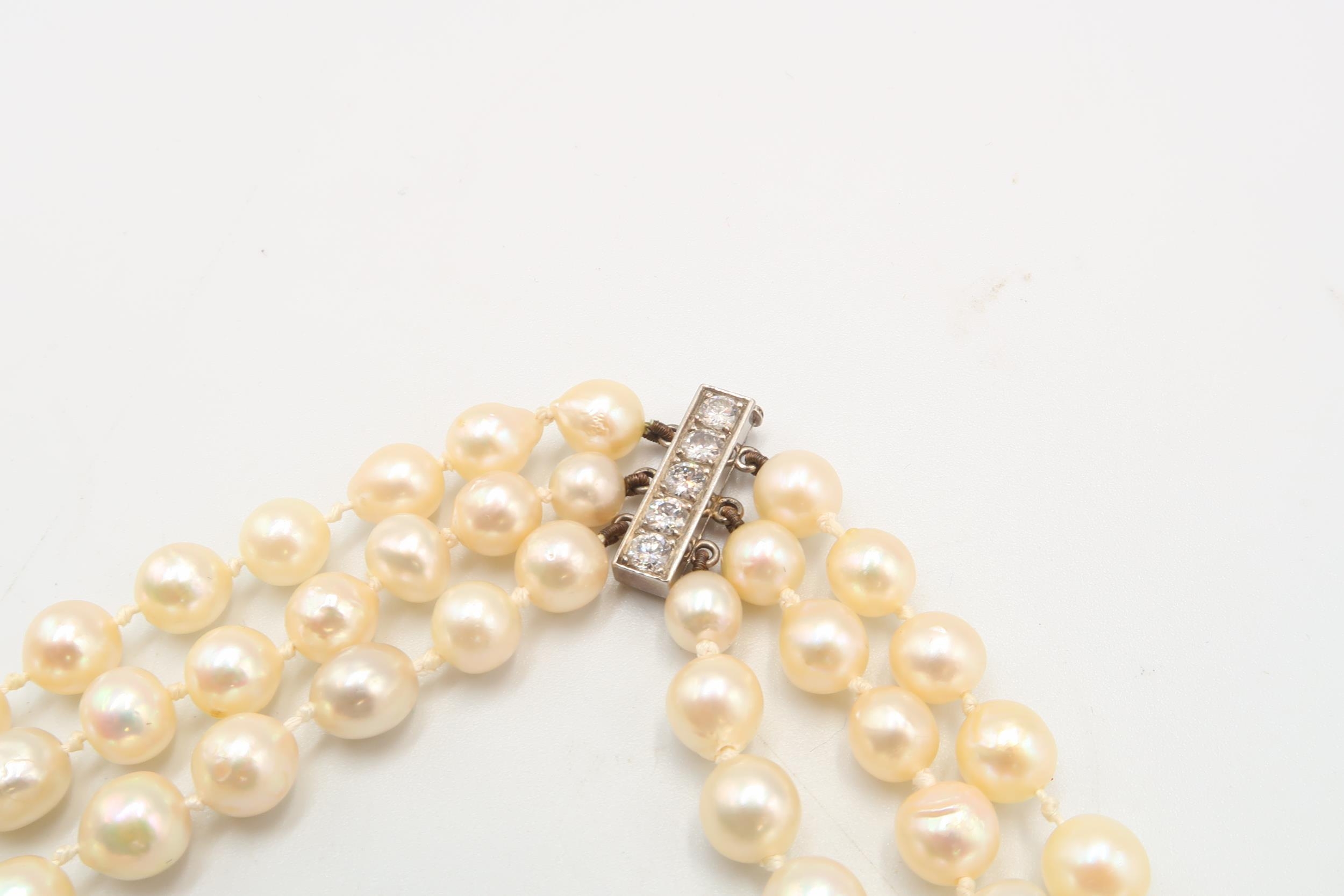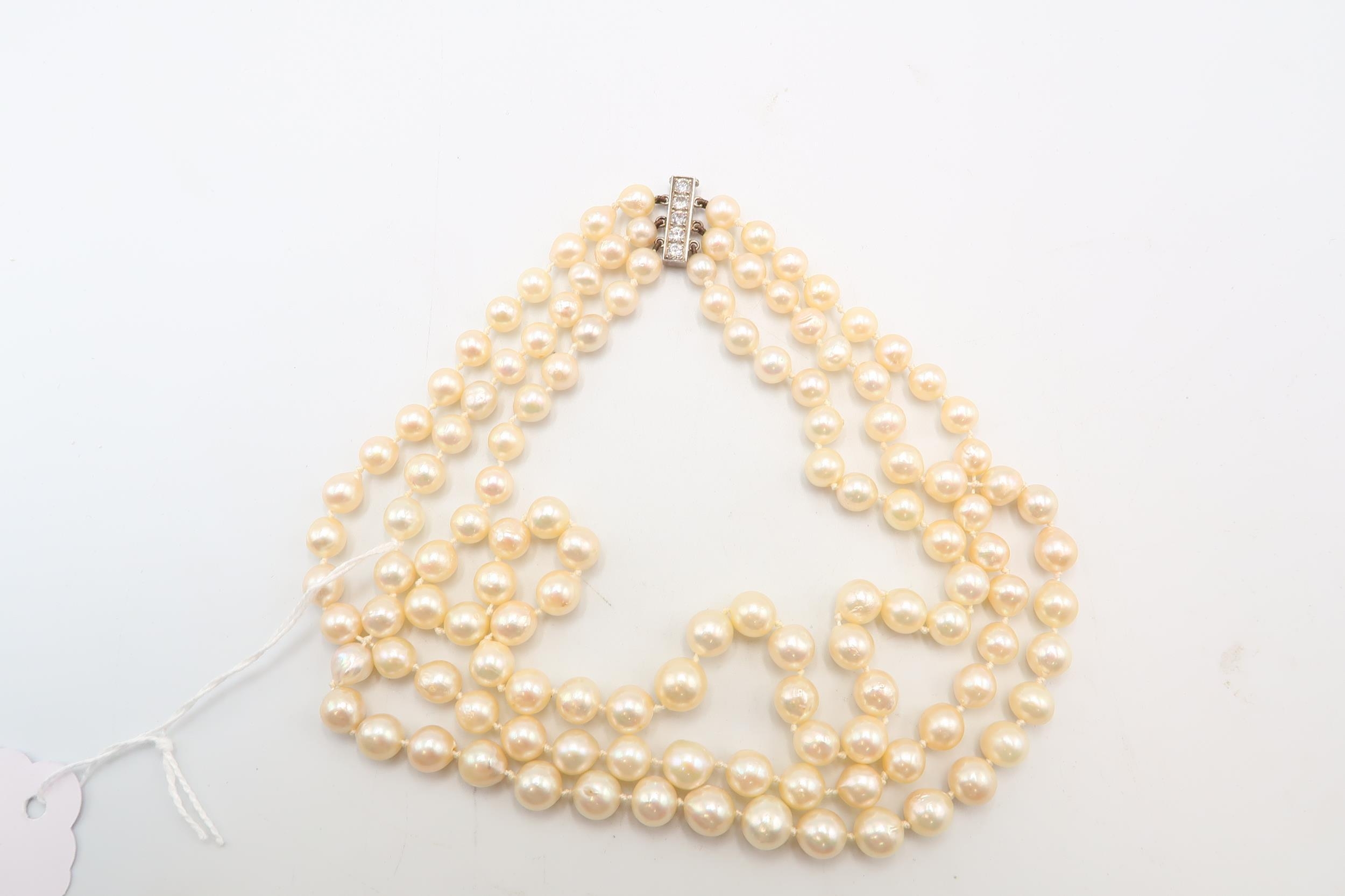 A 18ct & Diamond Three Strand Cultured Pearl Necklace, Clasp is of a bar form with Five Claw Set Round Diamonds .60ct.
