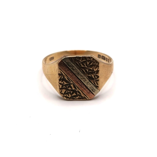 A 9ct gold signet ring with tri-colour detail decoration, size Y, 5.6g.