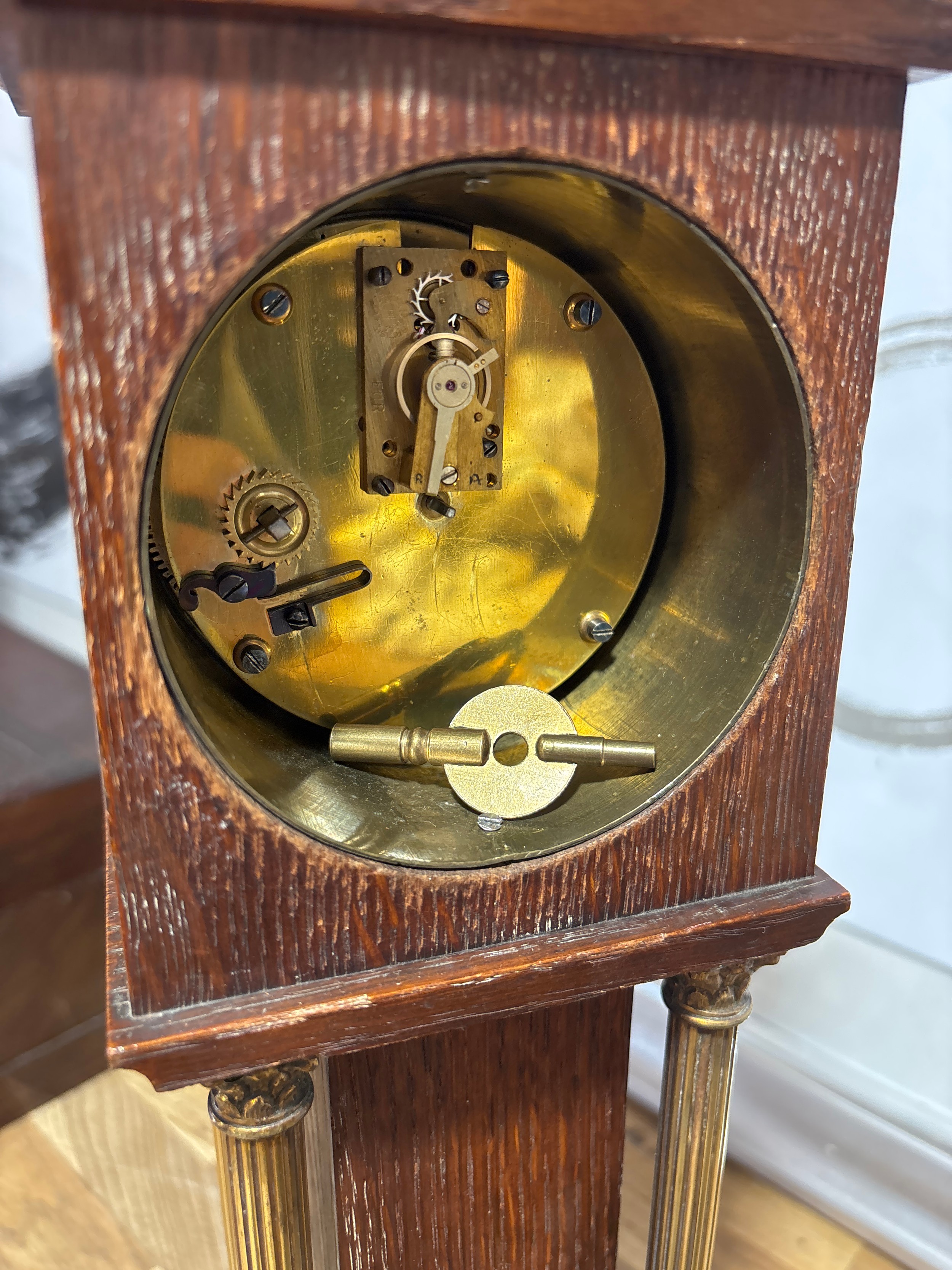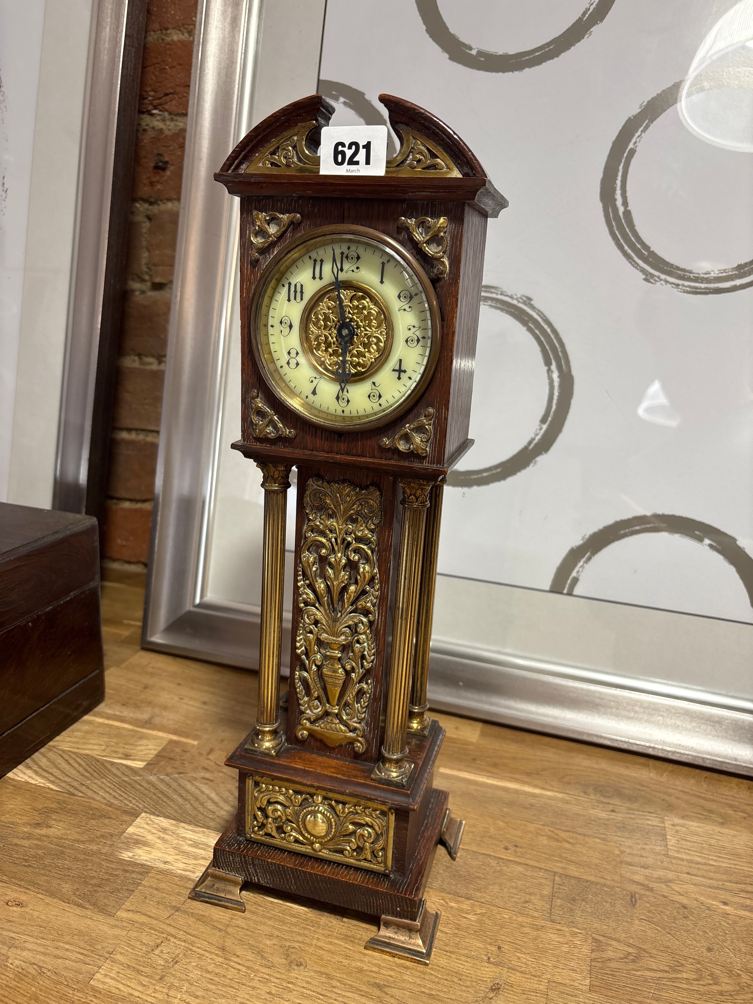 A Victorian Style Miniature Long Case Clock, Featuring an Oak Case with an Enamel Dial, Roman Numerals, Pierced foliate panels and Corinthian Columns. Condition: Winds, Ticks.
