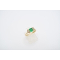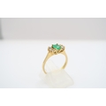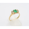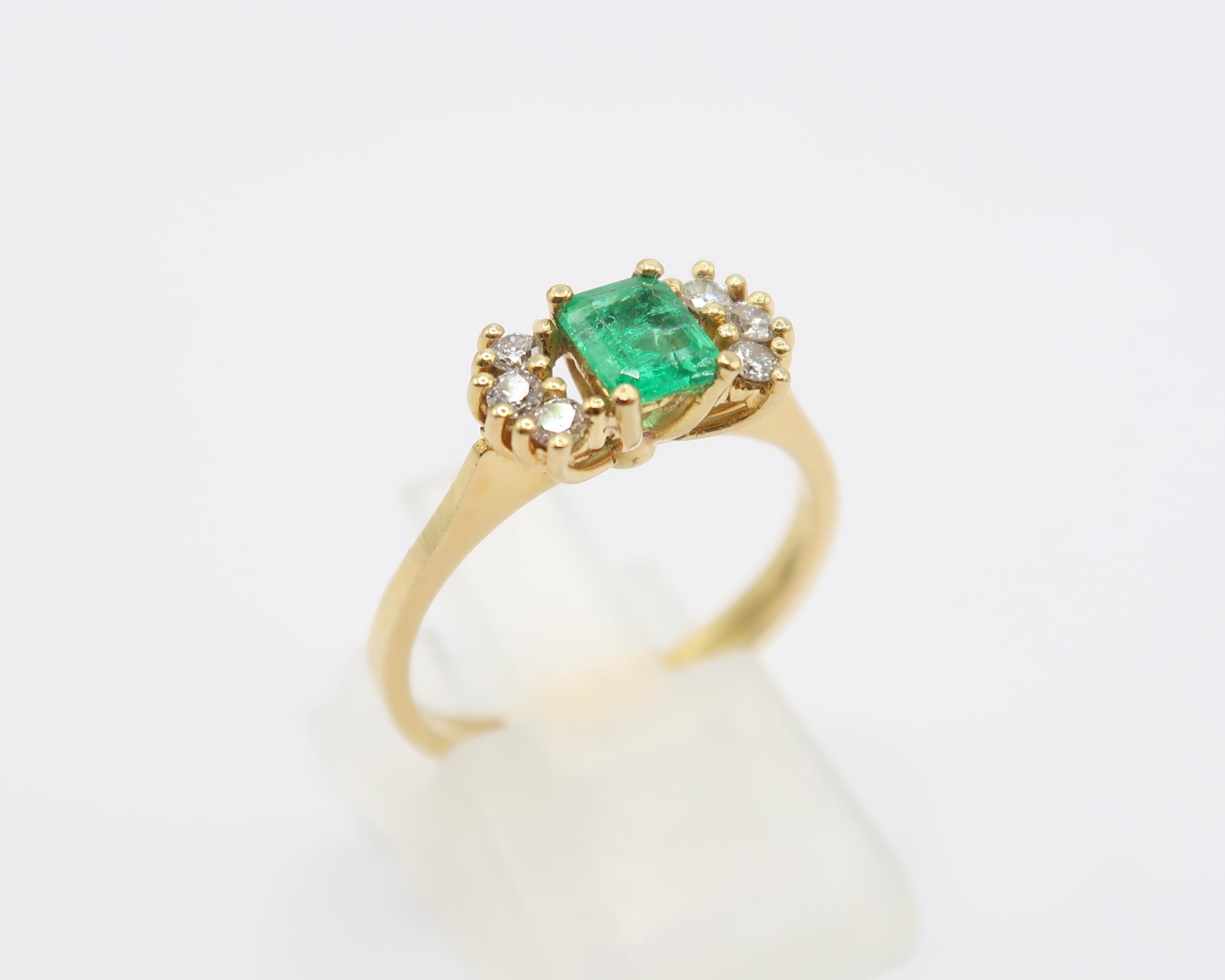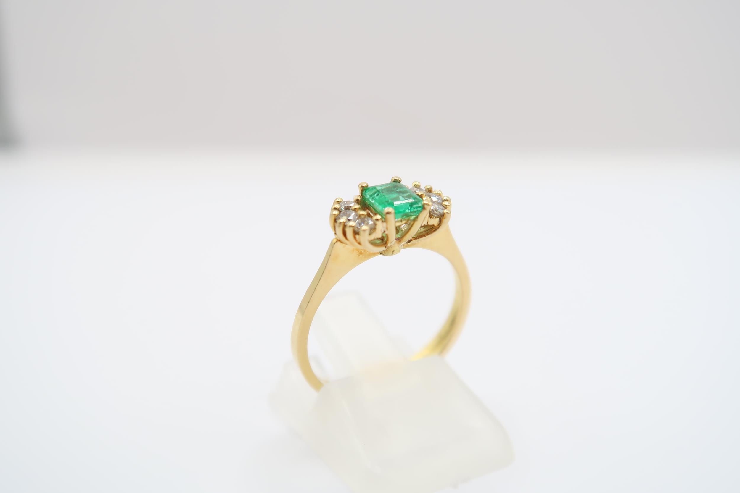 An 18ct yellow gold (tested) emerald and diamond ring, emerald has natural inclusions, diamonds bright and lively, head size approx 11mm x 6mm - ring size approx M Weight: 2.78g