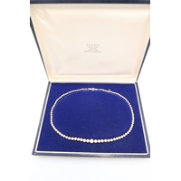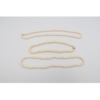A group of three cultured pearl necklaces, comprising one with integral wishbone link with drop pearl, one with three oval pearls intersperced with gold beads at the centre, and the other a string of hand knotted pearls of even size and colour, all with 9ct gold clasps, and a pair of pearl drop earrings.