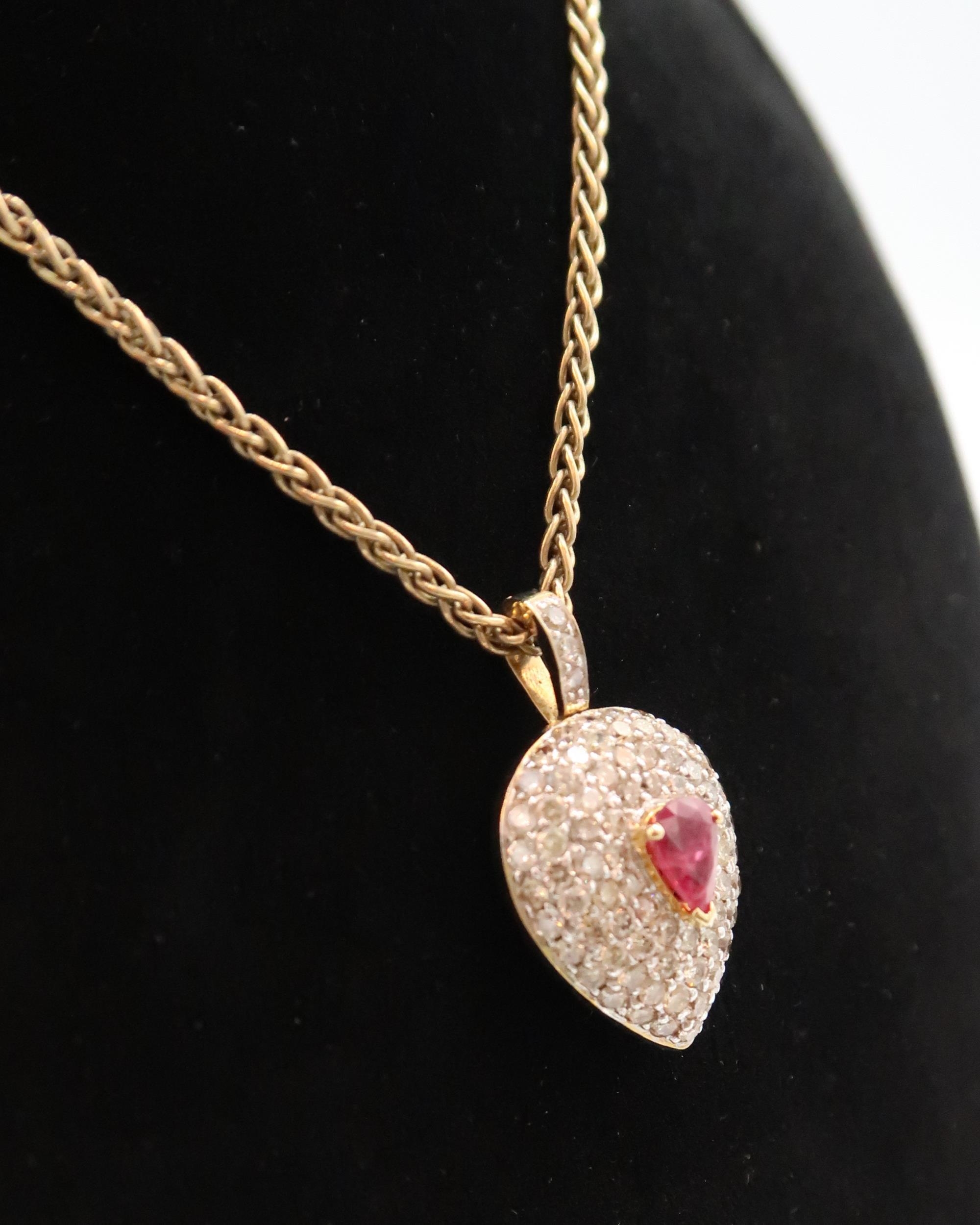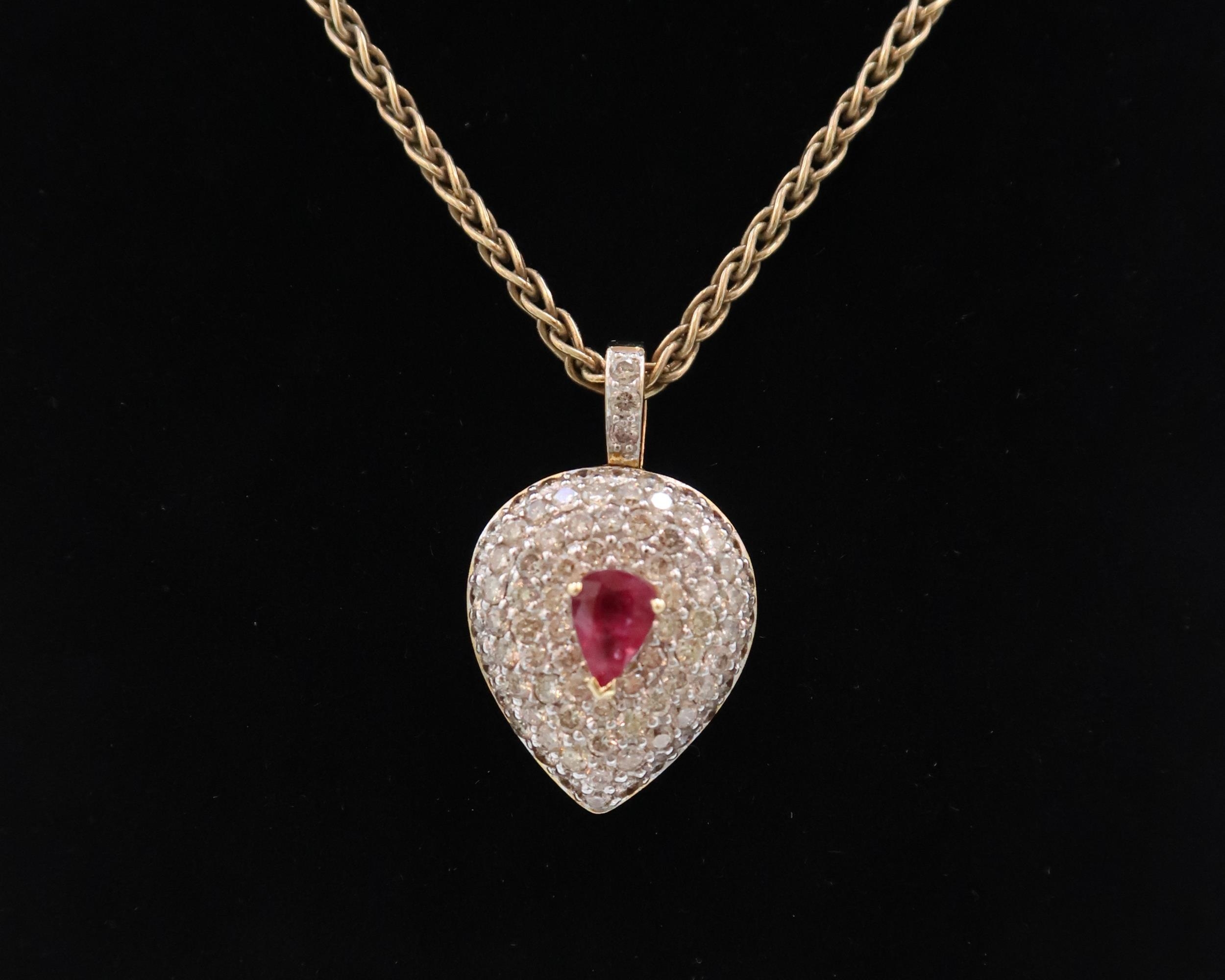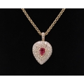 A pear shape ruby and diamond cluster pendant. Estimated total diamond weight 1.50ct J-M SI1/2. Stamped 18K. Weight 5.64 grams. Suspended from a 9ct chain weight 9.0 grams
