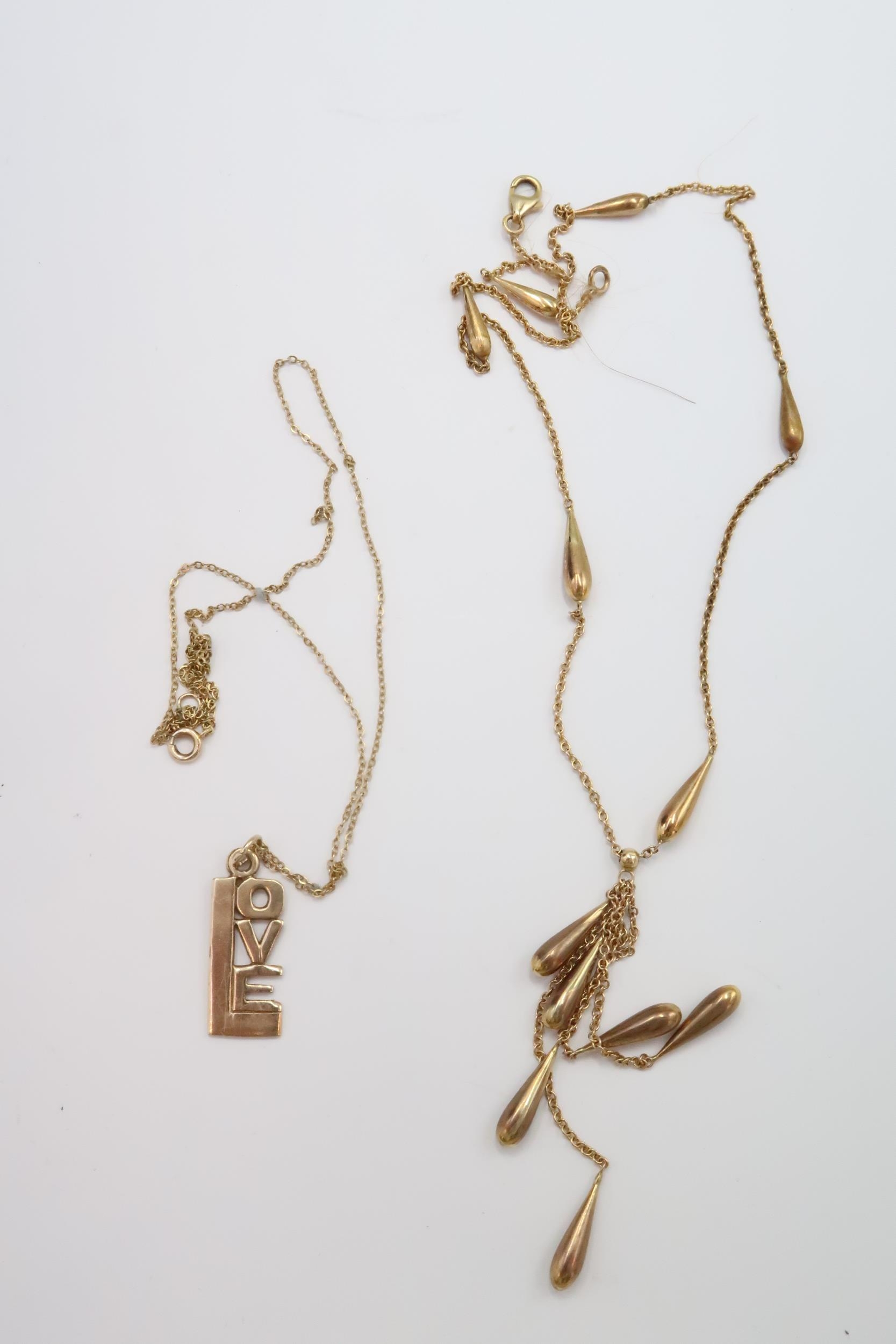 Two 9ct pendant necklaces to include a 'love' pendant and a teardrop panel drop necklace. Weight 9.70 grams